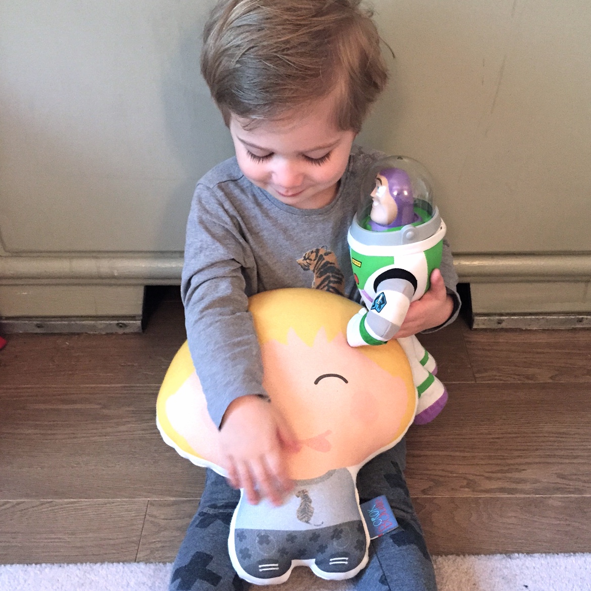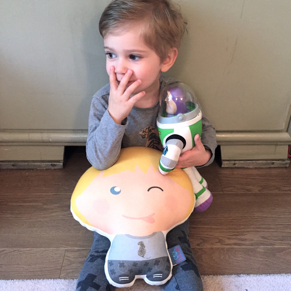 (Encore merci à Crokbouille pour ce super coussin personnalisé! Lucien porte son t-shirt préféré de la marque Arsène et les pipelettes et un leggings Zara kids.