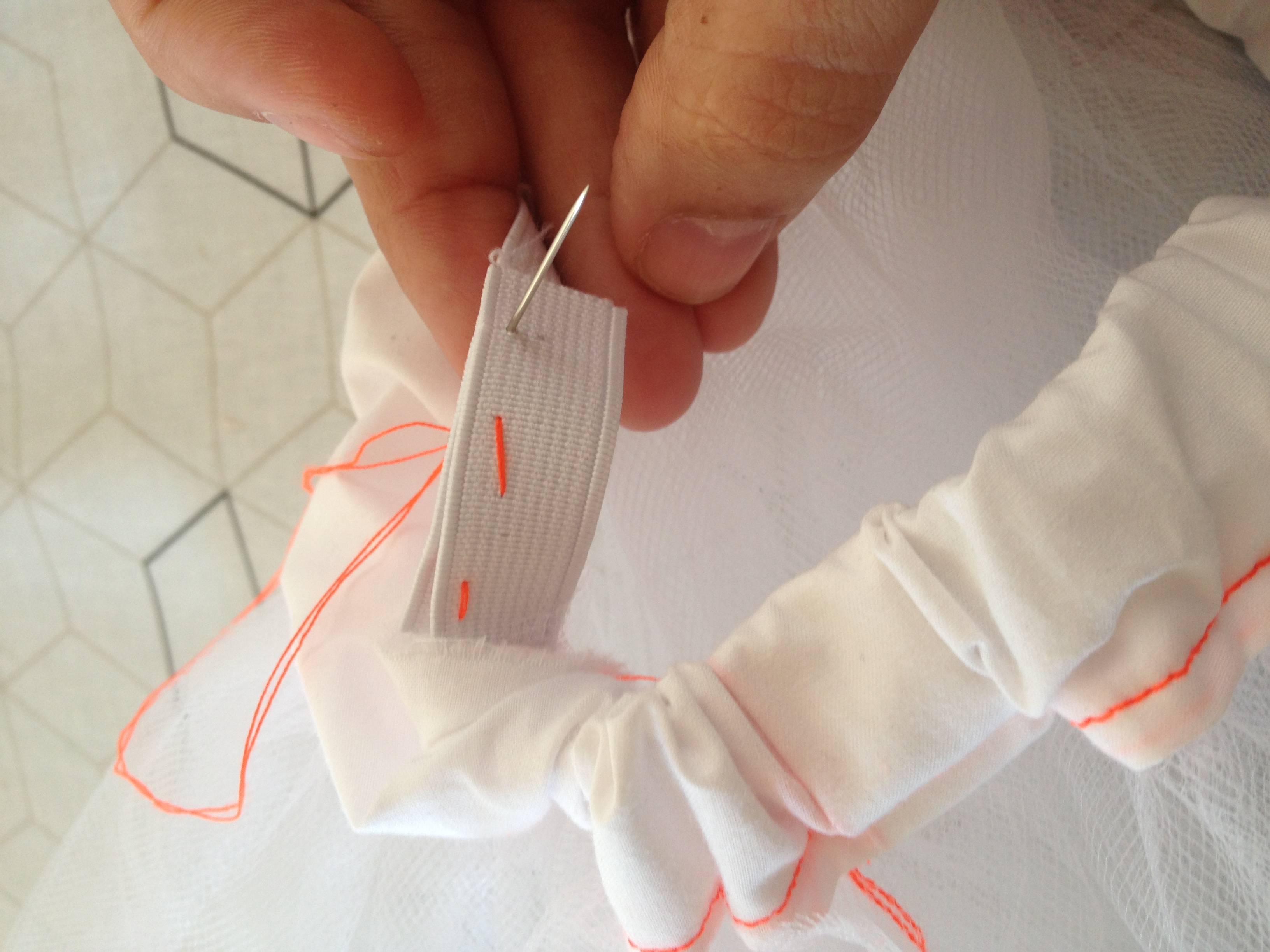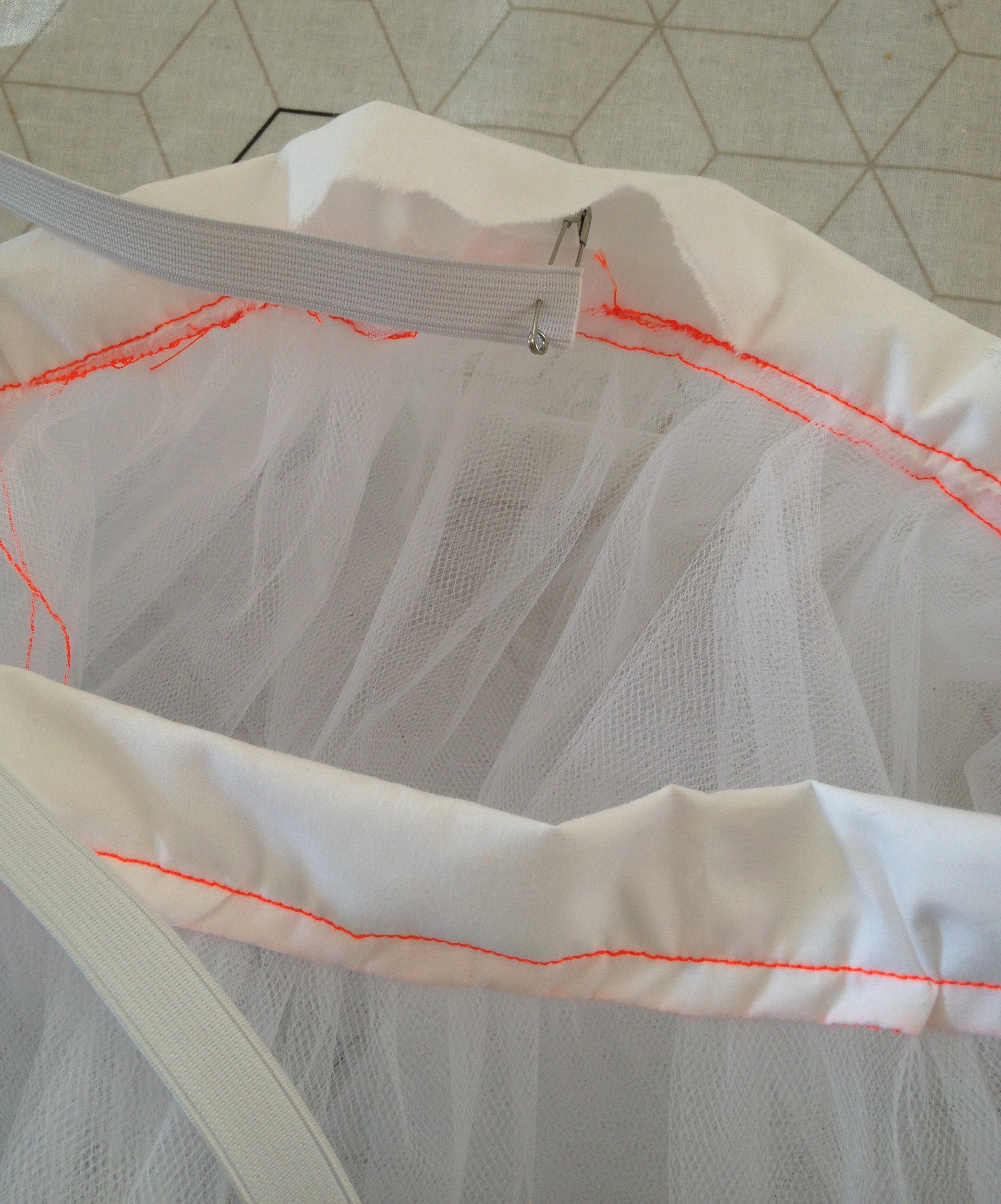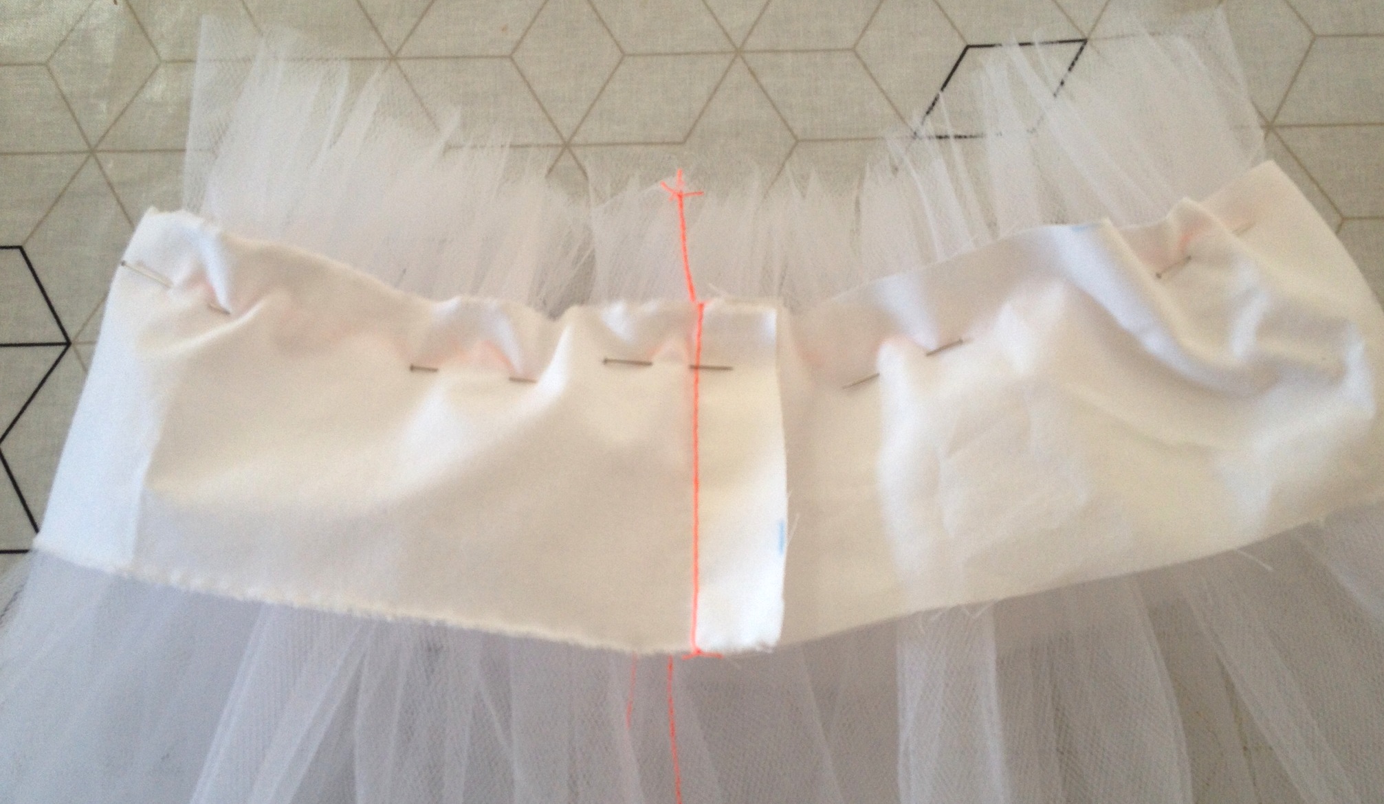 – Cousez la ceinture au dessous de la couture du tulle afin qu’elle soit cachée par la suite.