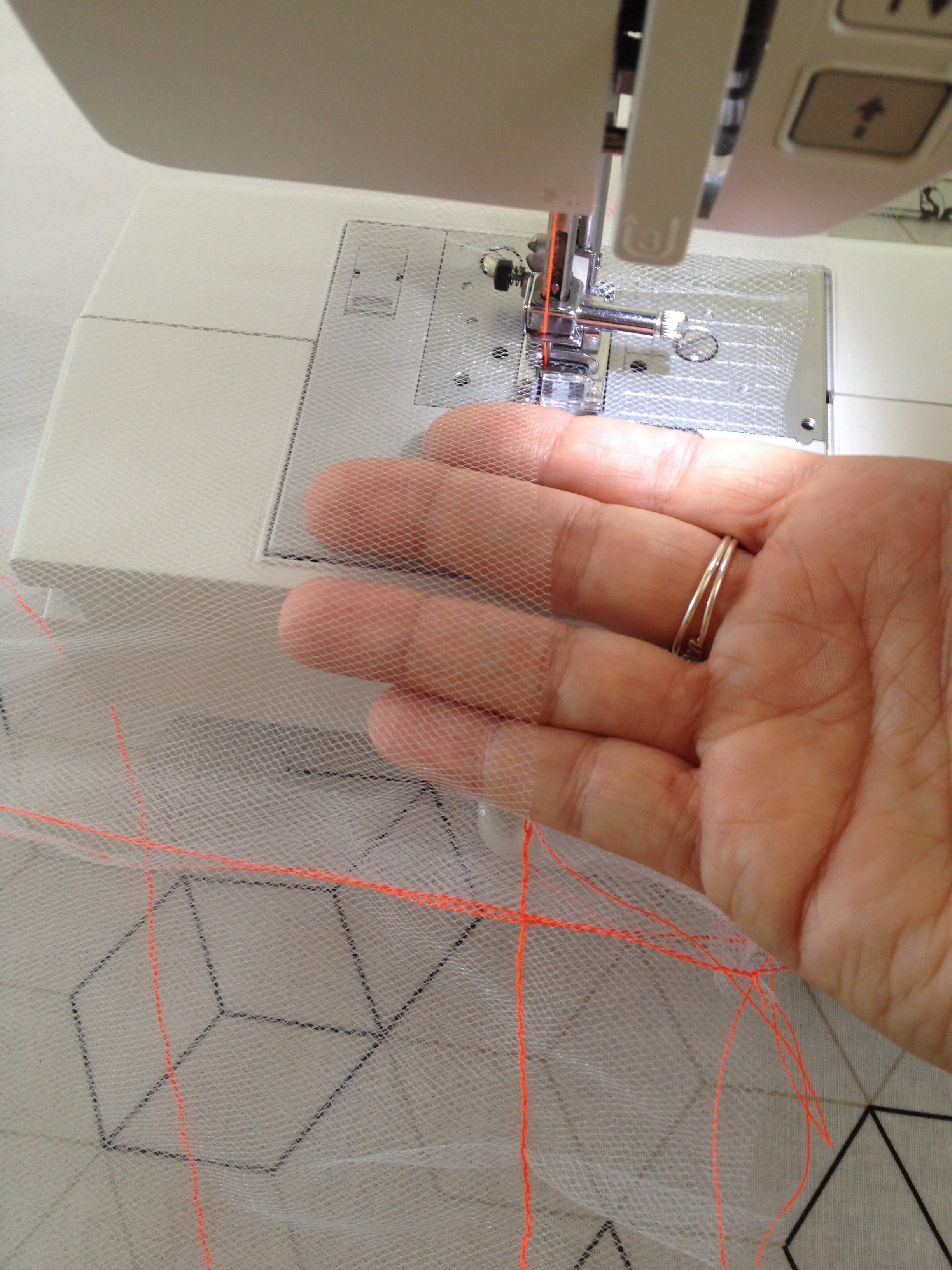 – Cousez avec un point large la partie ouverte. Je vous conseille de garder de la marge et de ne pas coudre trop prêt du bord car il est difficile de couper le tulle très droit et vous risqueriez d’avoir de mauvaises surprises si vous ne cousez pas très droit.
