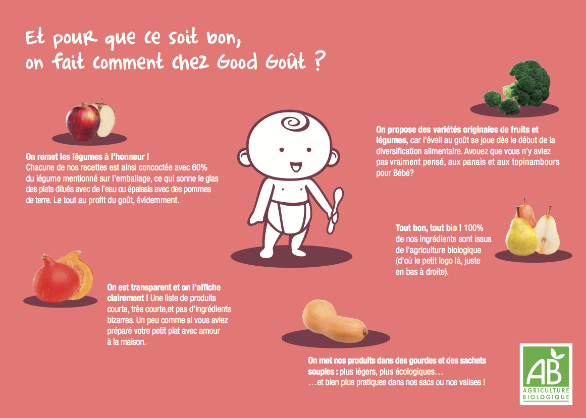 Parce que Good Goût, ce n’est pas une marque de petits plats pour bébés parmi tant d’autres. Non! Chez Good Goût, on met un point d’honneur à éduquer les papilles de nos têtes blondes, brunes ou rousses au bon et vrai goût des aliments.