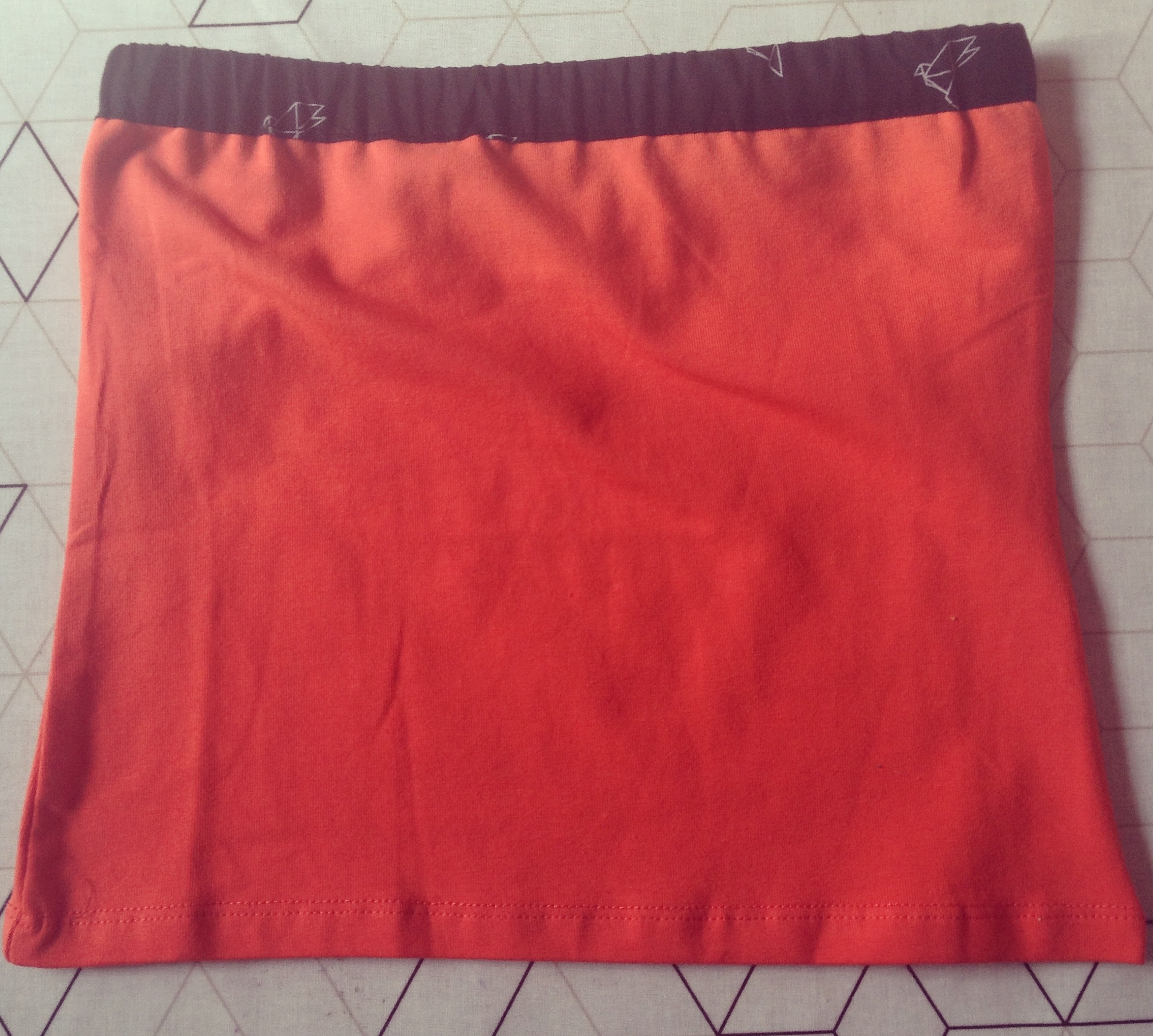 Couic, je décapite donc le t-shirt, je monte une ceinture, j’y glisse un élastique…et voilà le résultat! J’espère que les fesses de Louise vont passer. Au pire elle le mettra en bustier!