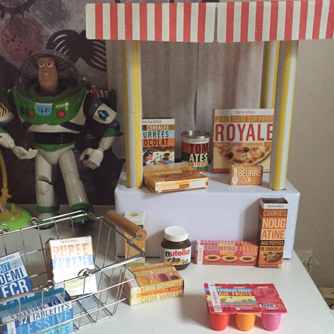 Hier, en passant devant le reste de mes pochettes My little day, j’ai eu envie de leur bricoler une petite marchande! Une boite en carton, 2 rouleaux de panier cadeaux et un peu de colle et de scotch plus tard, je leur avais confectionné un petit étalage pour mettre en avant les produits.