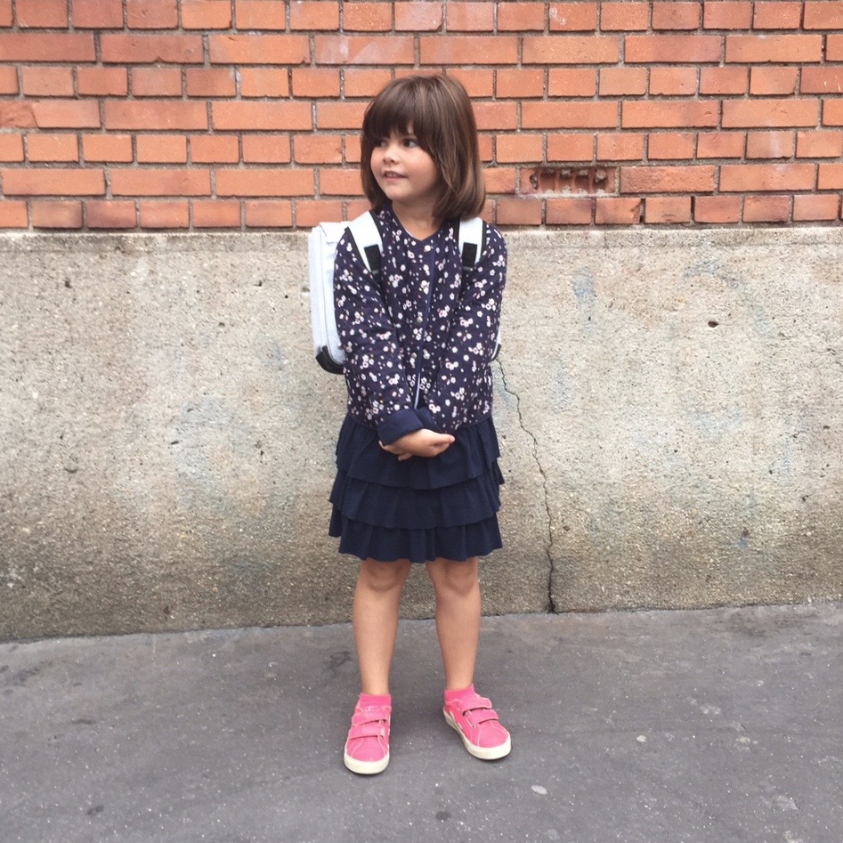 Louise porte un gilet* et une jupe à volants* de la nouvelle collection Petit Bateau, des baskets Veja et un cartable qui brille* de la marque qui monte qui monte Caramel & Cie.