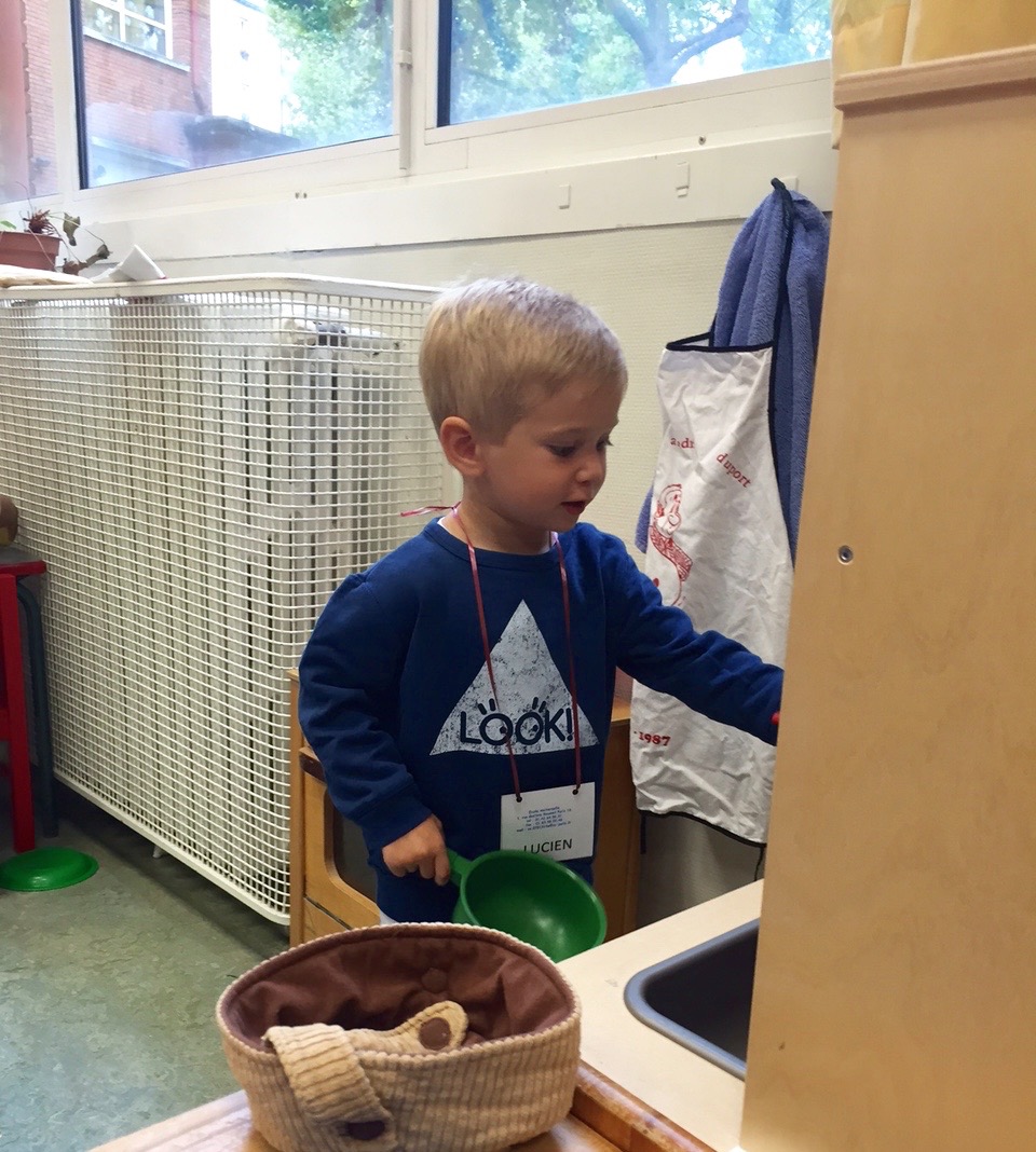 Lucien a hésité longtemps avant de quitter mes bras et puis finalement il est allé jouer au coin cuisine.