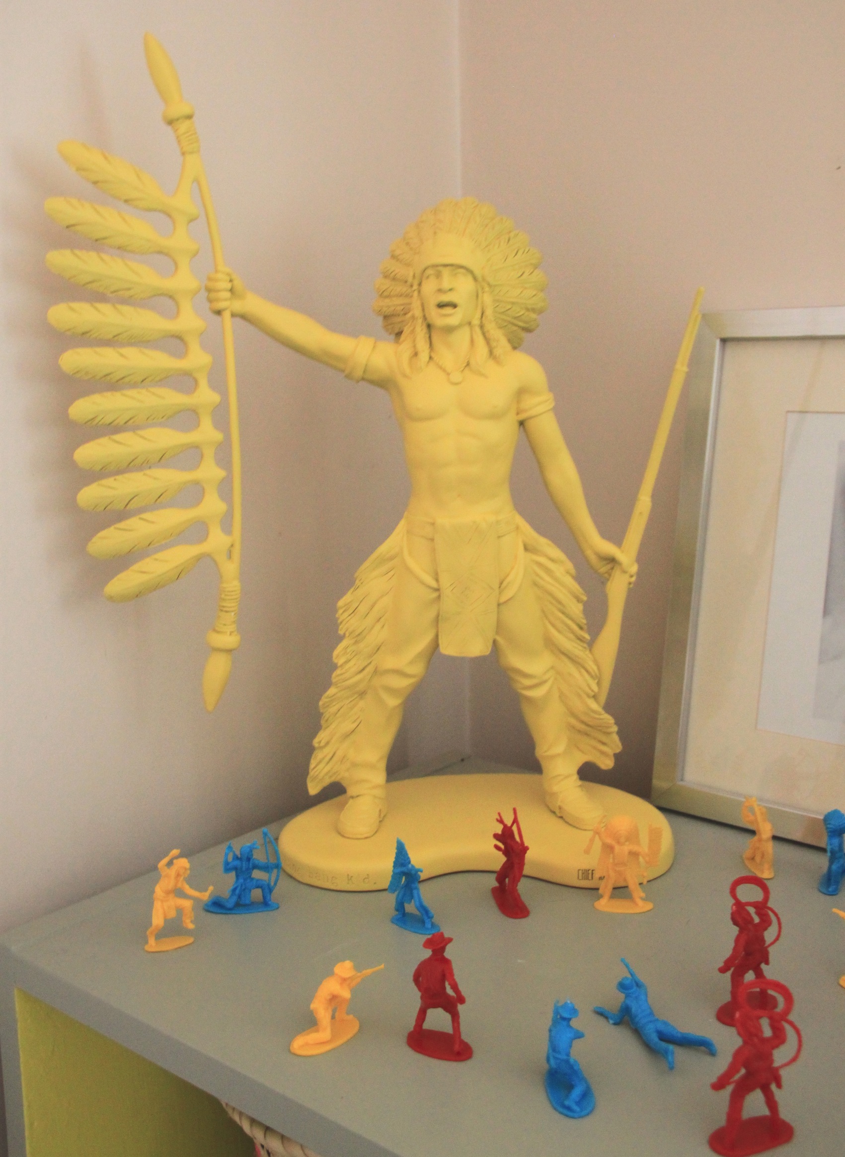 J’ai craqué pour la statuette indien de Bang Bang Kid devant laquelle je bavais depuis longtemps (elle coûte chère mais ouah, quel effet!). Pour qu’elle ne soit pas trop perdue sur le meuble, j’ai rajouté des minis figurines indiens et cowboys trouvées sur Chacha Drugstore (si vous êtes à la recherche de petits cadeaux pour un anniversaire, c’est là qu’il faut regarder).