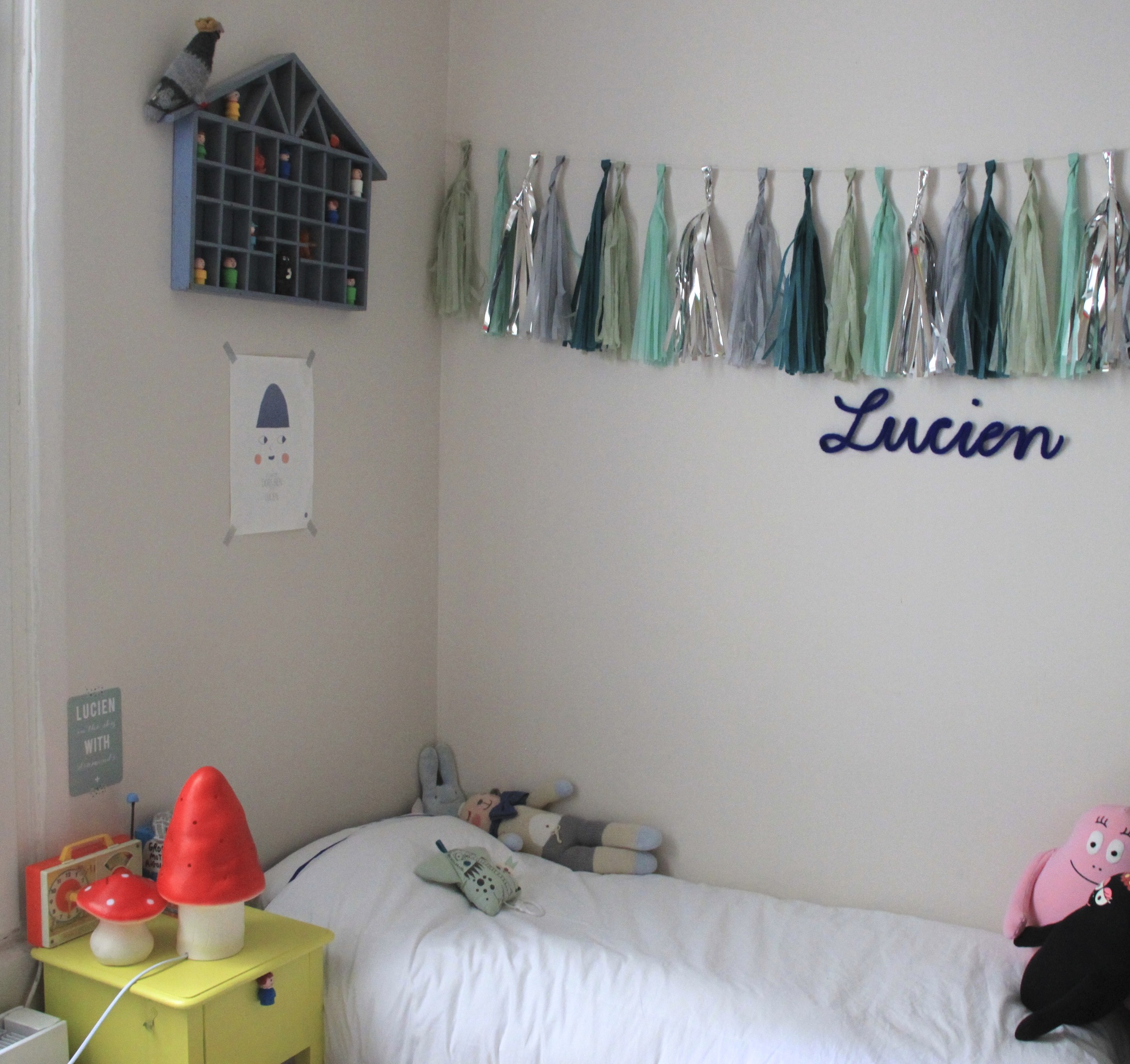 Enfin, j’ai accroché la guirlande Tassel qui décorait la salle lors de la réception au dessus de son lit.
