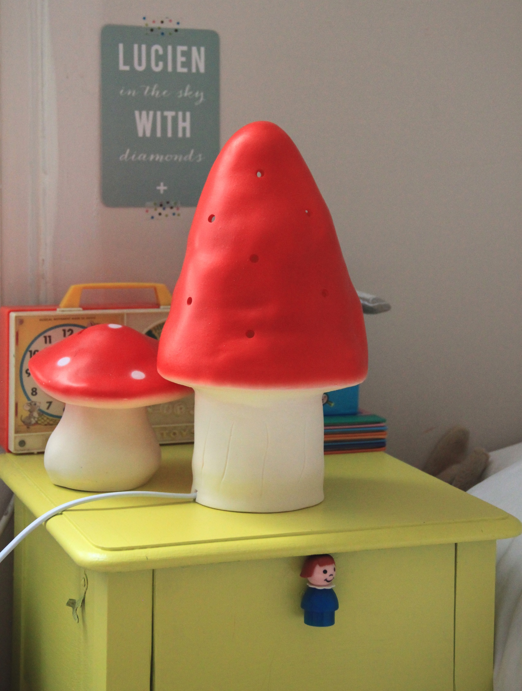 Pour sa table de nuit, j’ai choisi une lampe champignon Egmont Toys qui va à merveille avec la tirelire qu’il avait déjà.