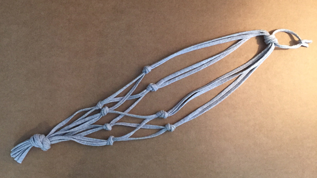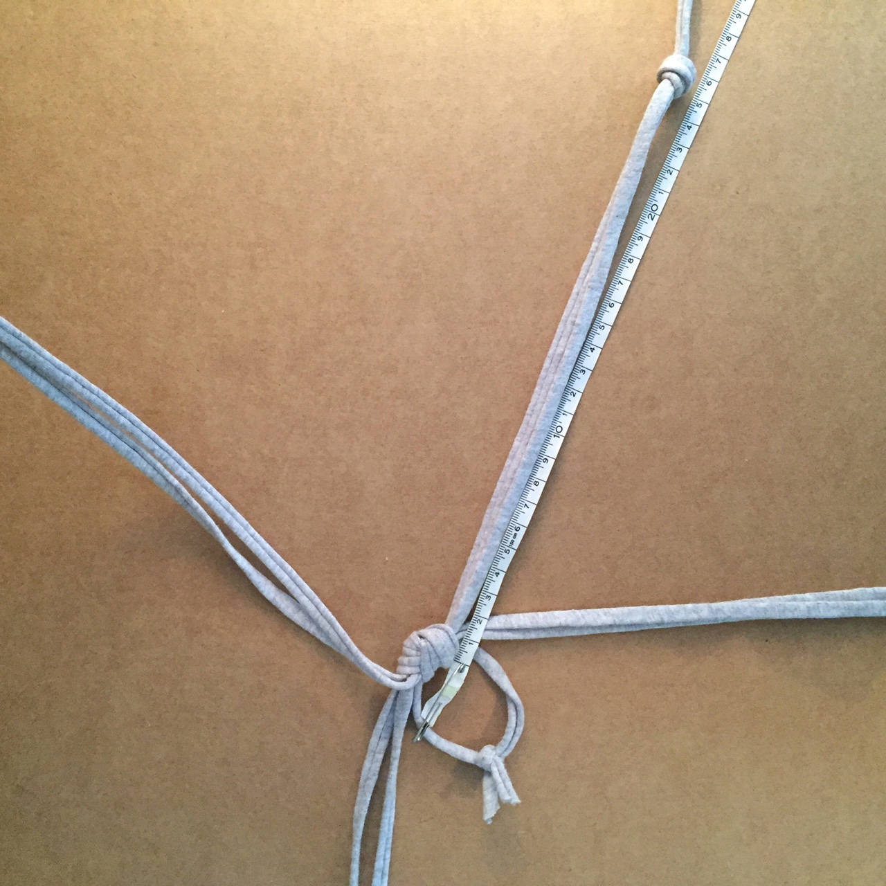 3. Rassembler les 2 fils les plus proches et faire un noeud à 25 cm. Faire la même chose sur les autres.