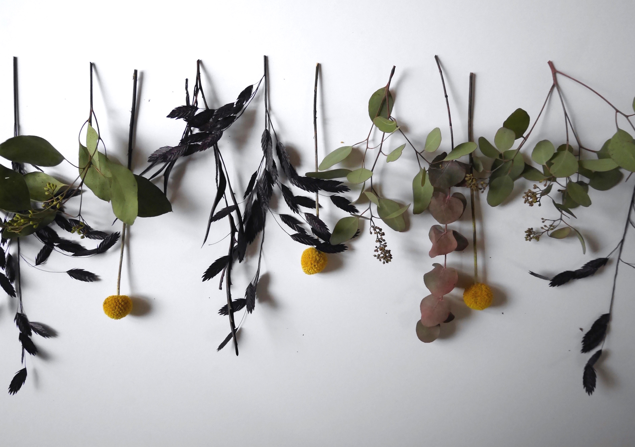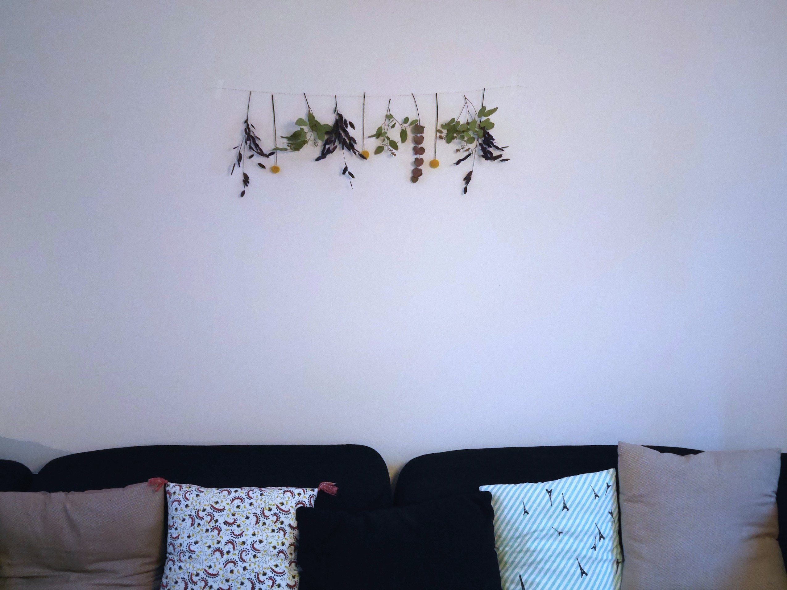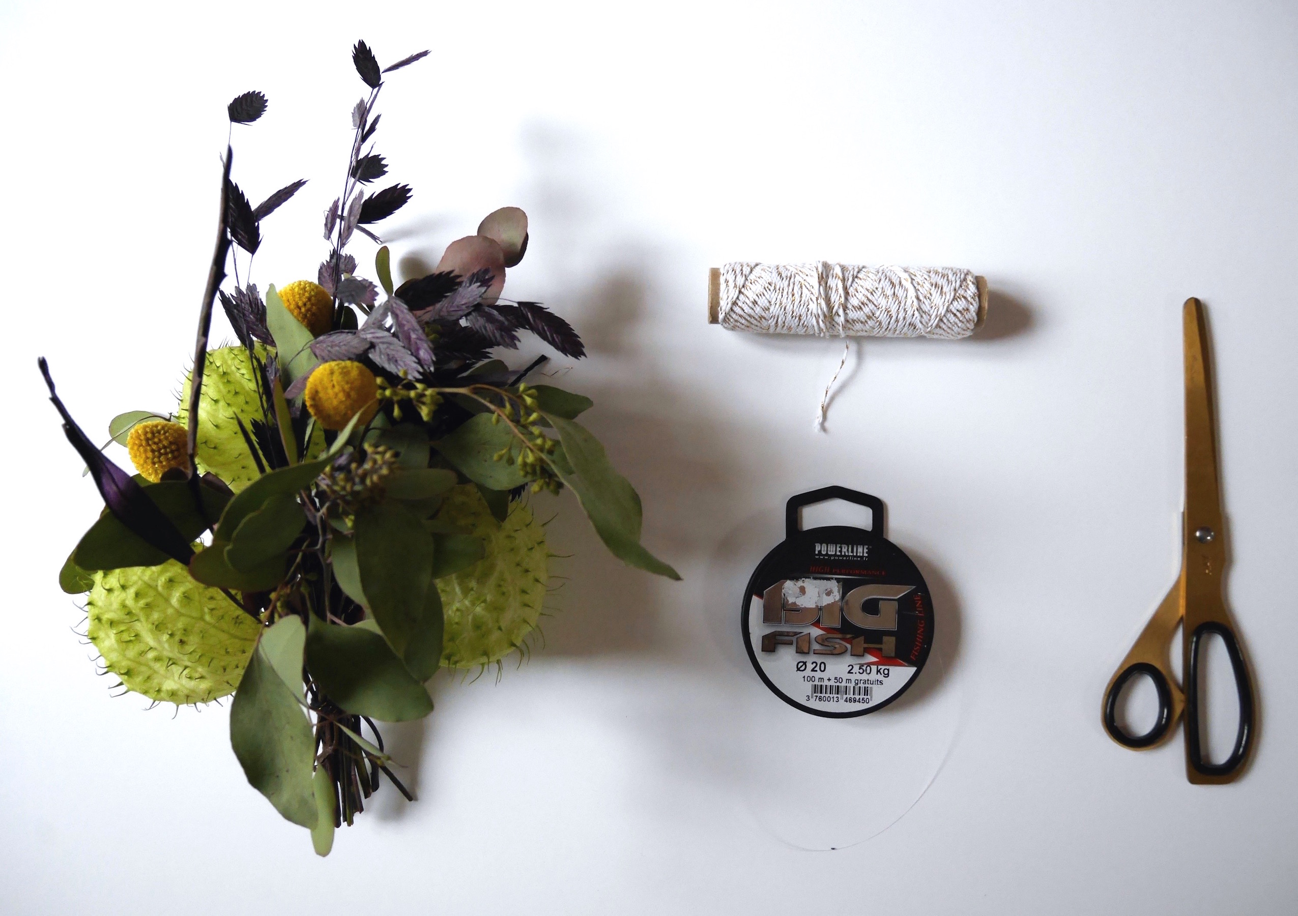 L’idée est de donner une seconde vie à un bouquet de fleurs en réalisant une guirlande de fleurs. Pour ma part j’achète depuis quelques temps essentiellement des fleurs qui peuvent se faire sécher et je les accroche un peu partout dans mon appartement. Hortensias, eucalyptus, craspedis (les jolies petites boules jaunes) et j’en passe!