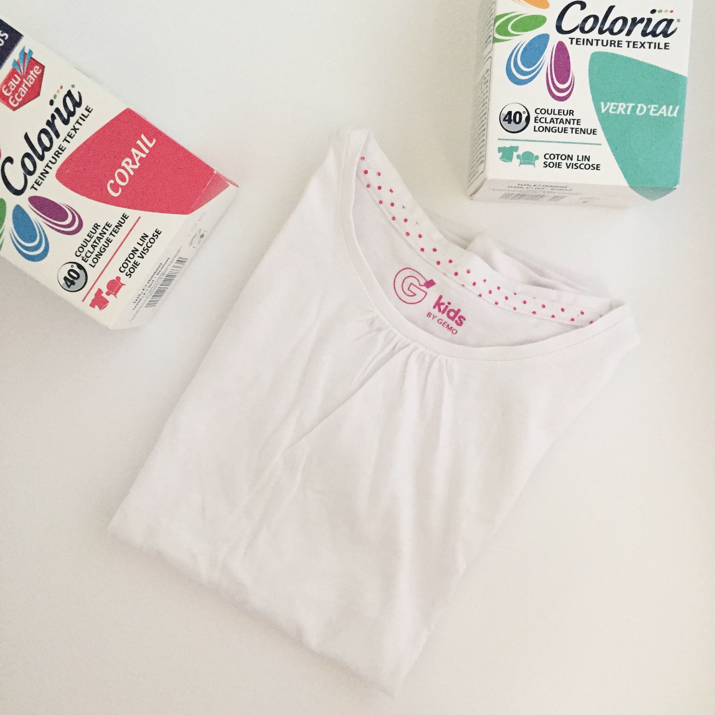 J’ai découvert les teintures Coloria l’année dernière. Avec 2 couleurs, je m’étais amusée à faire un t-shirt tie and dye et un filet de courses pour Louise (revoir ici).