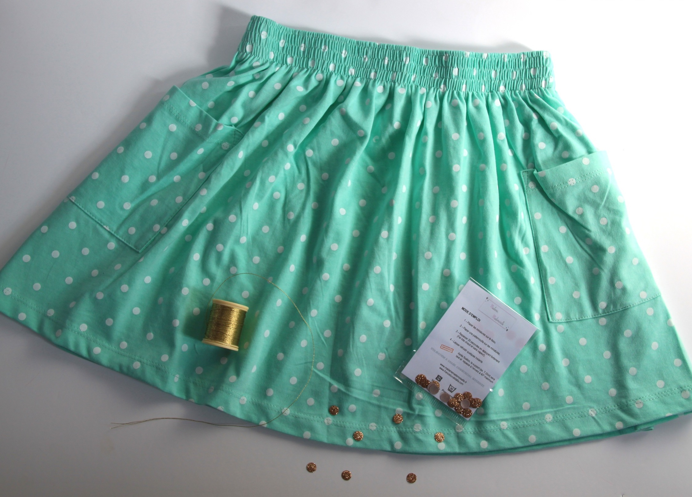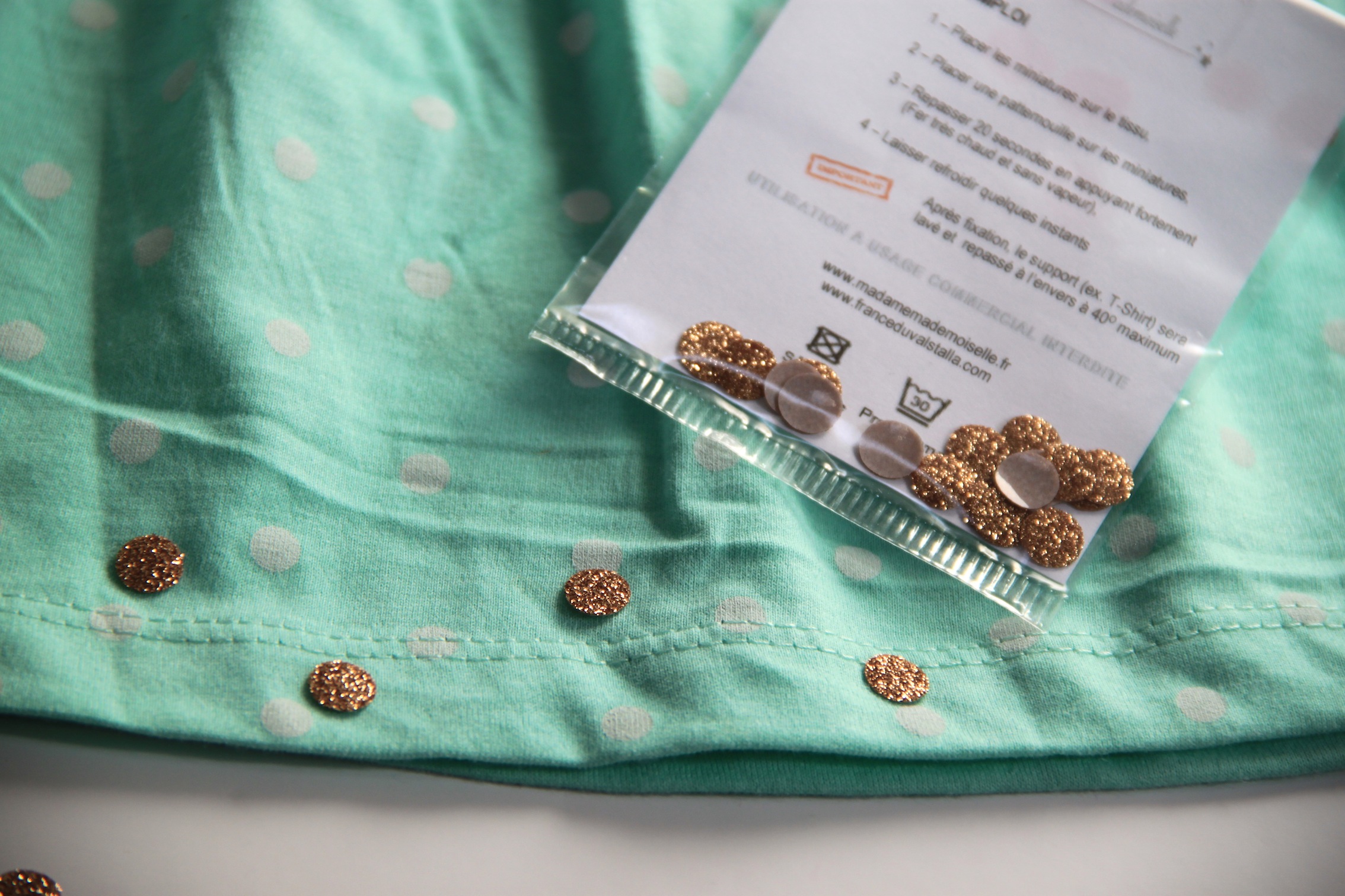 – Des minis pastilles thermocollantes Madame Mademoiselle vendues notamment chez France Duval Stalla. Si vous utilisez une jupe unie, vous pouvez aussi opter pour les petites biches, les libellules, etc.