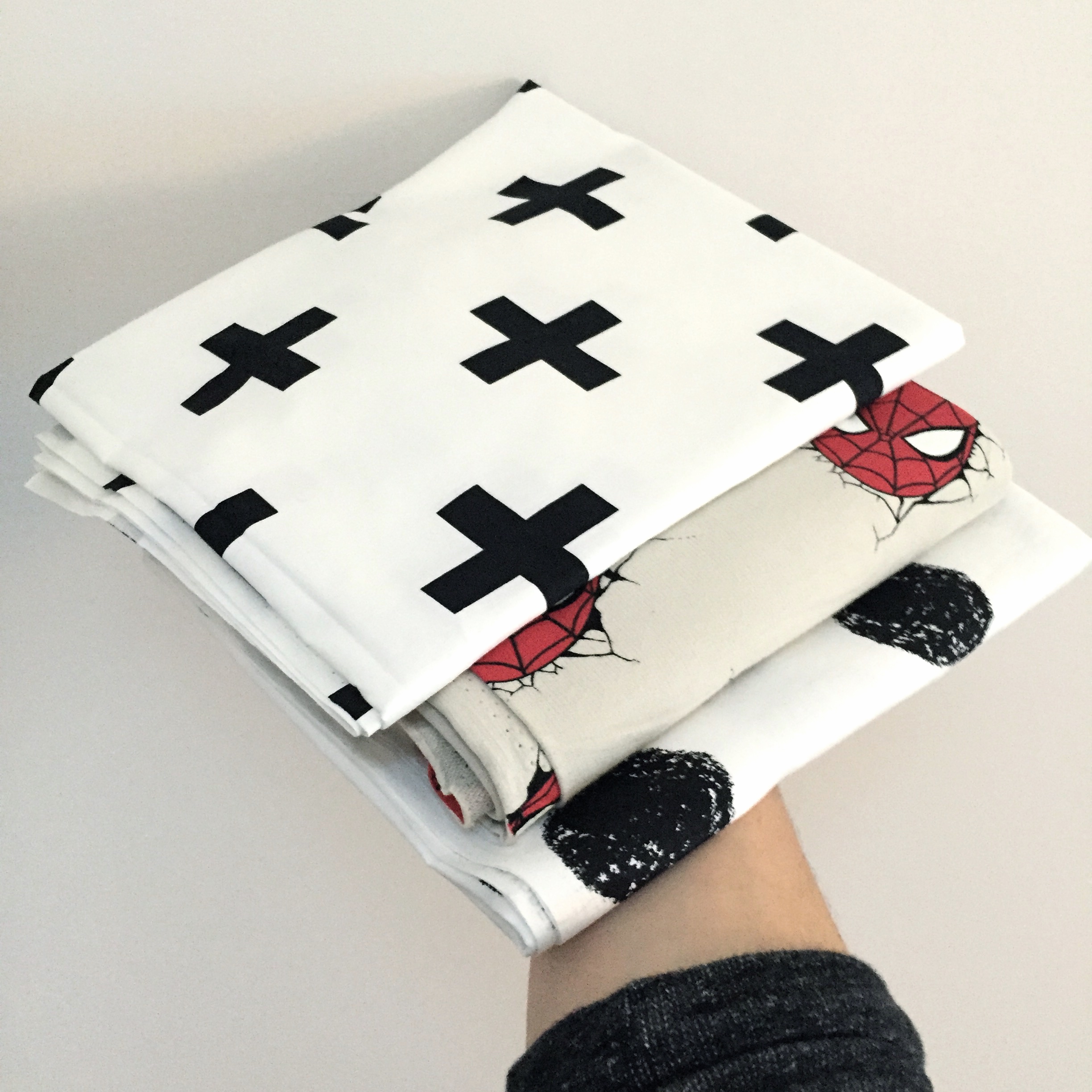 Et puis hier j’ai reçu mon joli tissu commandé sur Etsy. Je me suis dit qu’il serait plus joli en top (le tissu Spiderman a terminé en housses de coussin pour Lucien, il est ravi. Et pour celui à pois, je n’ai pas encore d’idées).
