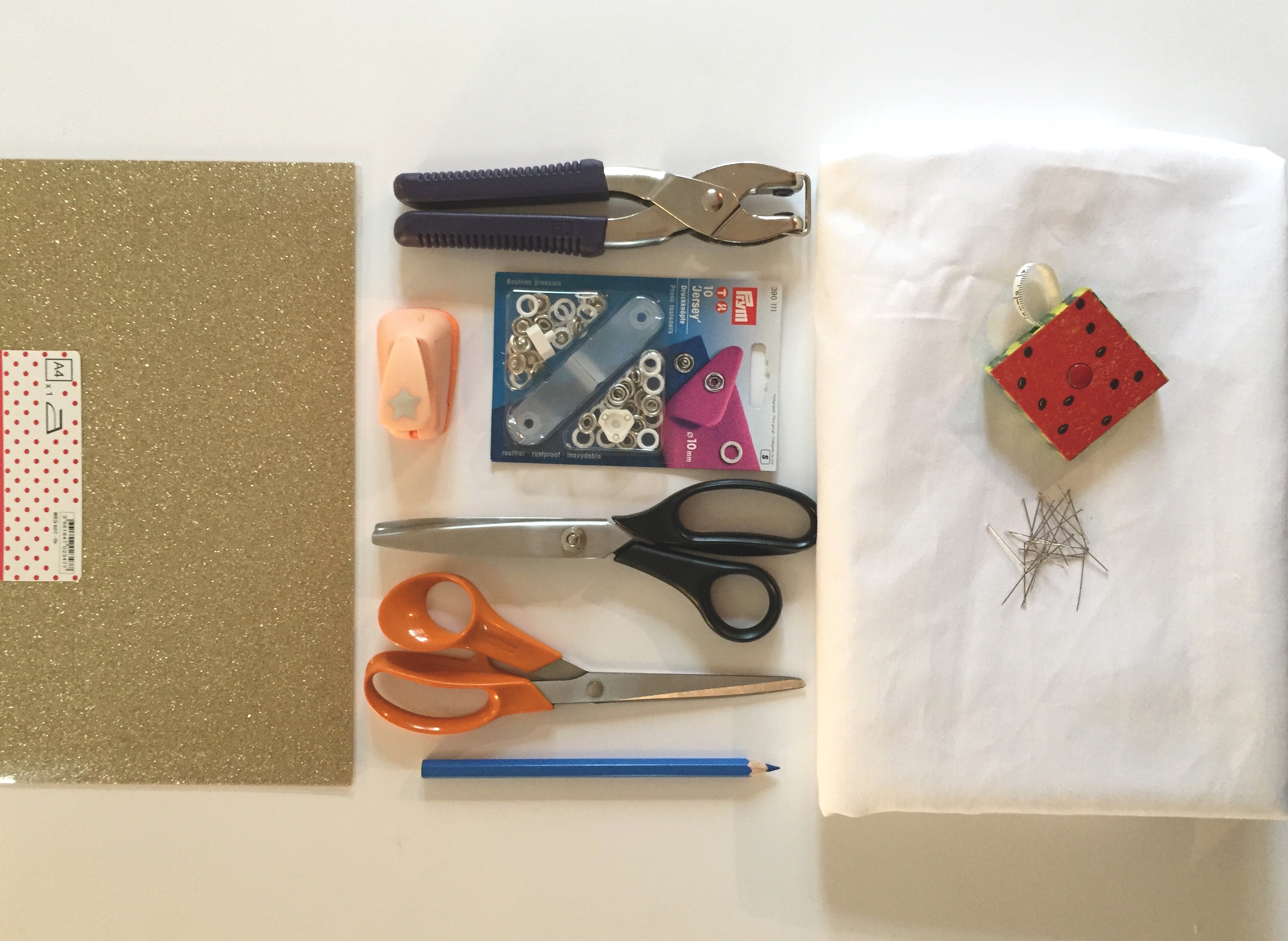 Si vous n’avez pas de machine à coudre : un morceau de tissu format 0,75 x 2,35 cm / des ciseaux cranteur / un crayon de couture (ou un crayon de papier) / un mètre de couturière / des aiguilles / des pressions / du flex thermocollant / une perforeuse.