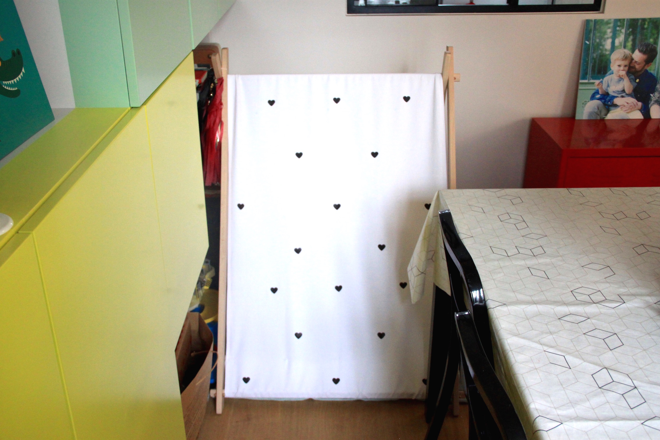 Pour le moment, nous avons laissé la tente dans notre salon mais l’avantage est qu’elle se démonte (et se remonte) en un tour de main et se range facilement derrière une porte ou sous un lit.