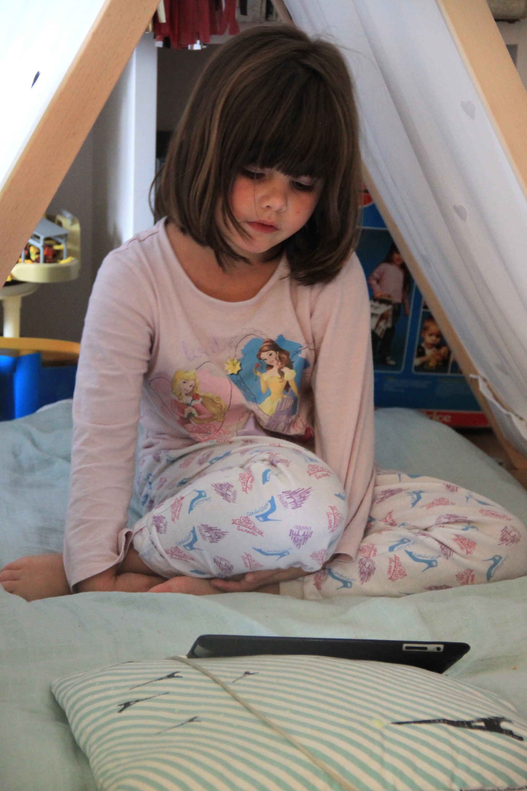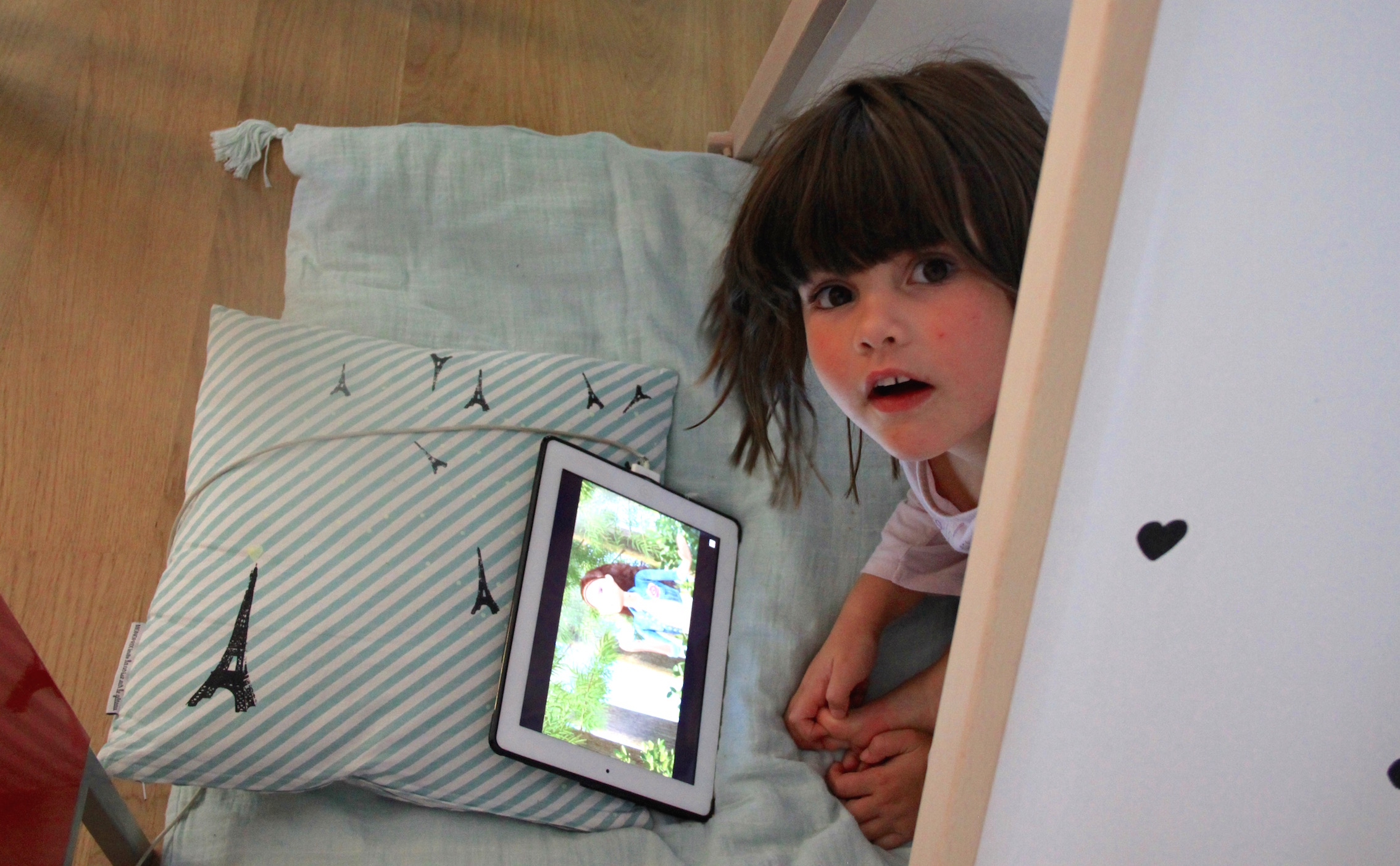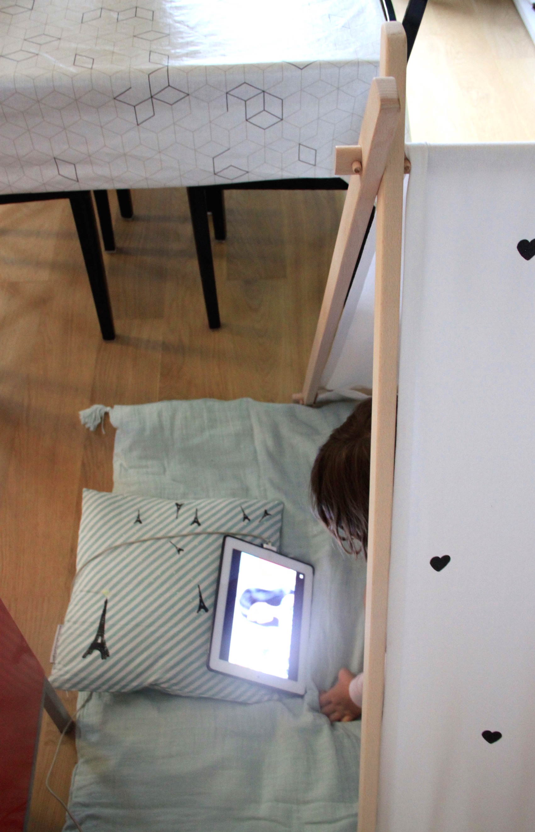 Louise adore s’y installer pour regarder un dessin animé sur l’iPad tranquille. Il faut dire que je lui ai fait un petit coin bien douillet avec une couette bien moelleuse et une housse toute douce de la marque Moumout’.