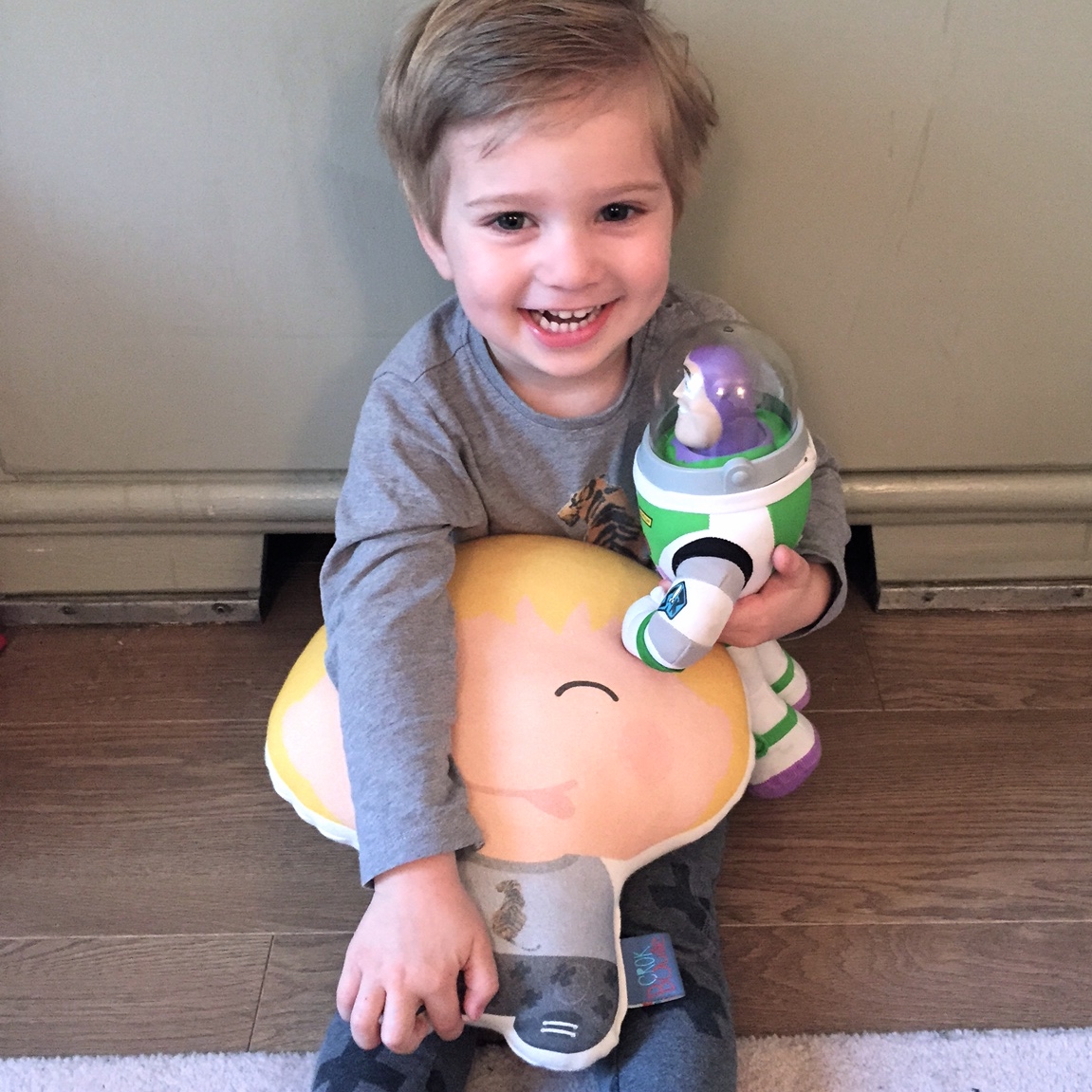 (Encore merci à Crokbouille pour ce super coussin personnalisé! Lucien porte son t-shirt préféré de la marque Arsène et les pipelettes et un leggings Zara kids.