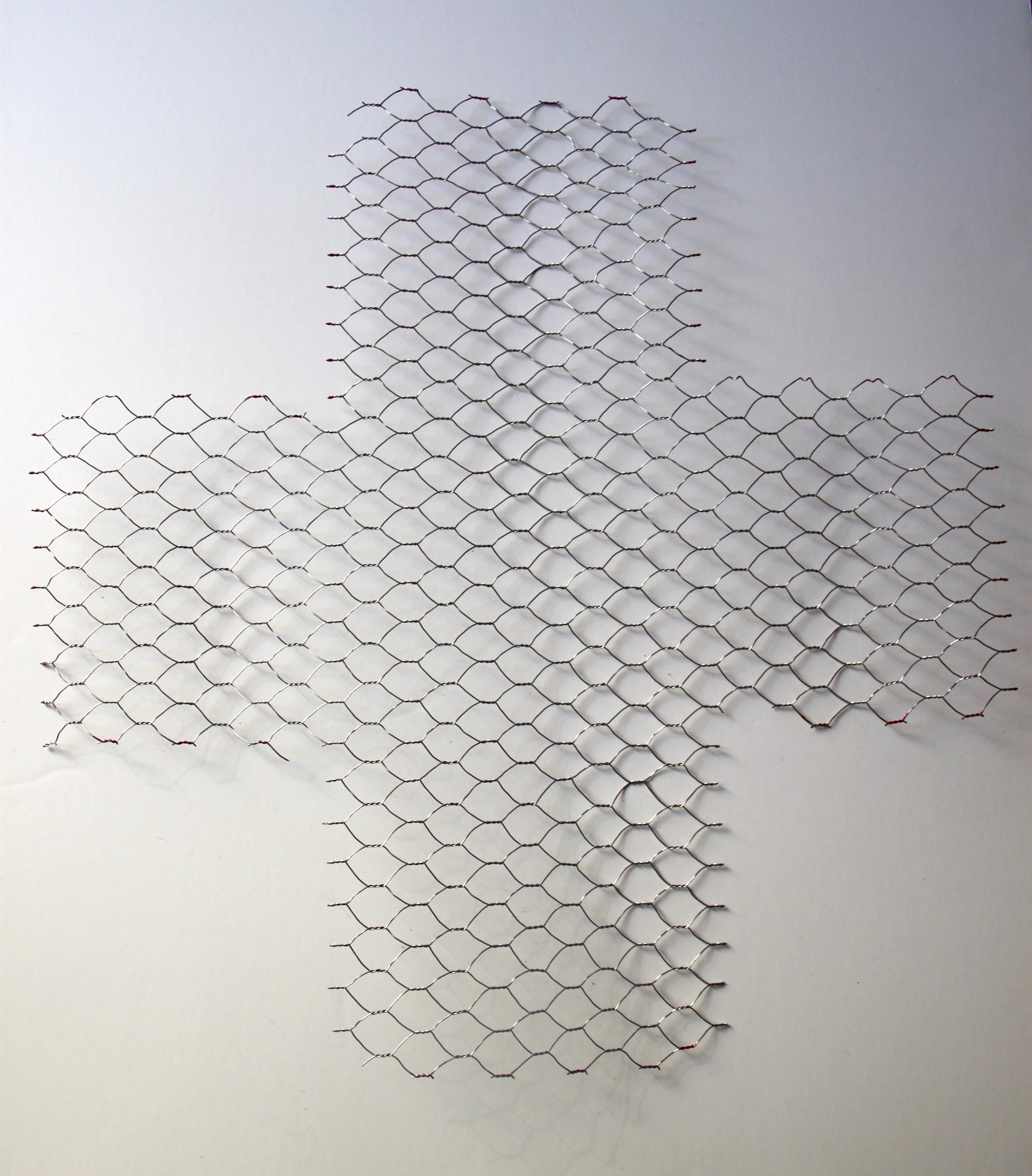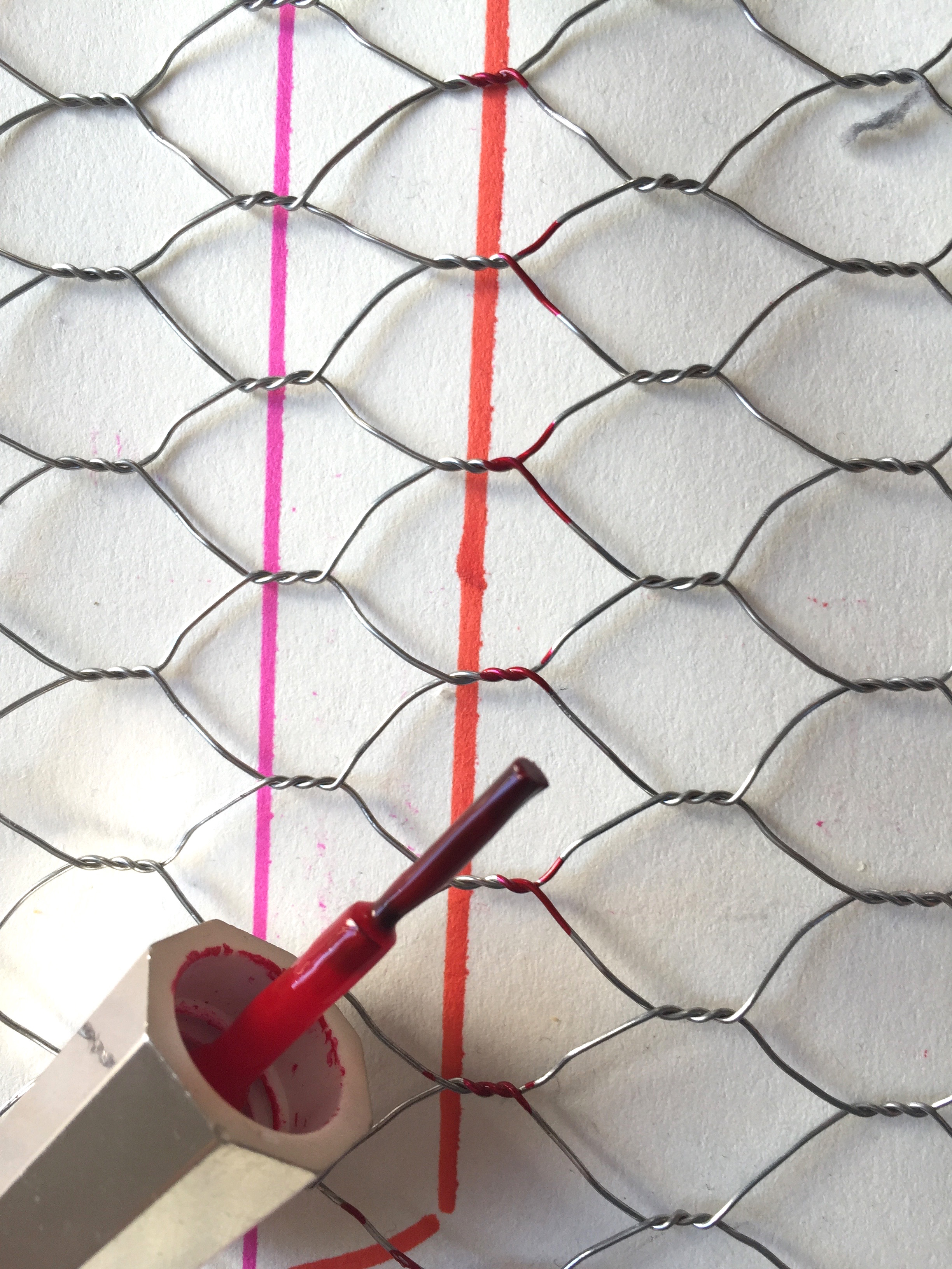 2. Report du gabarit sur le grillage : placer le gabarit sous le grillage puis tracer des repères grâce à du vernis à ongles.