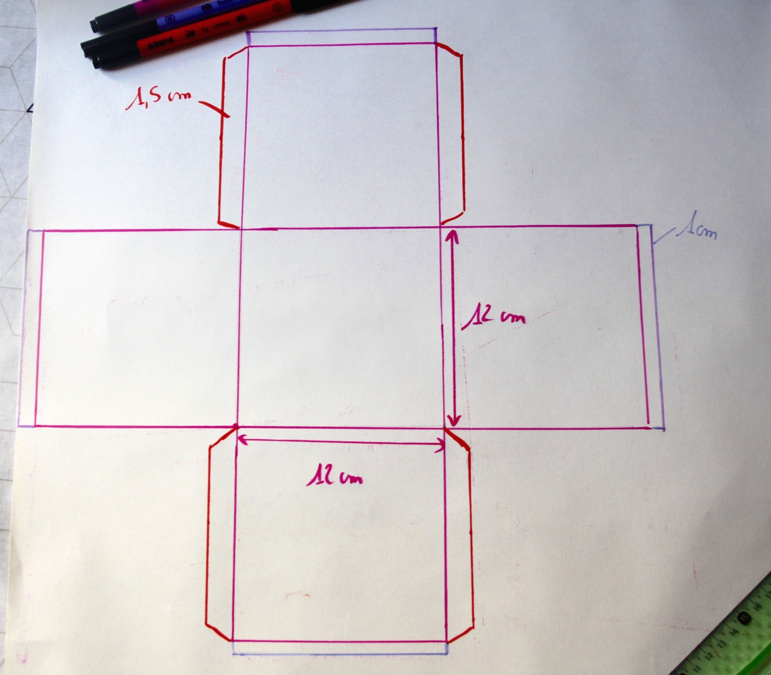 1. Préparation du gabarit : réaliser le gabarit de votre corbeille à plat sur la feuille de papier (en rose). Prévoir de la marge pour « fermer » la corbeille (en rouge) et en haut pour replier les fils qui dépassent (en violet).