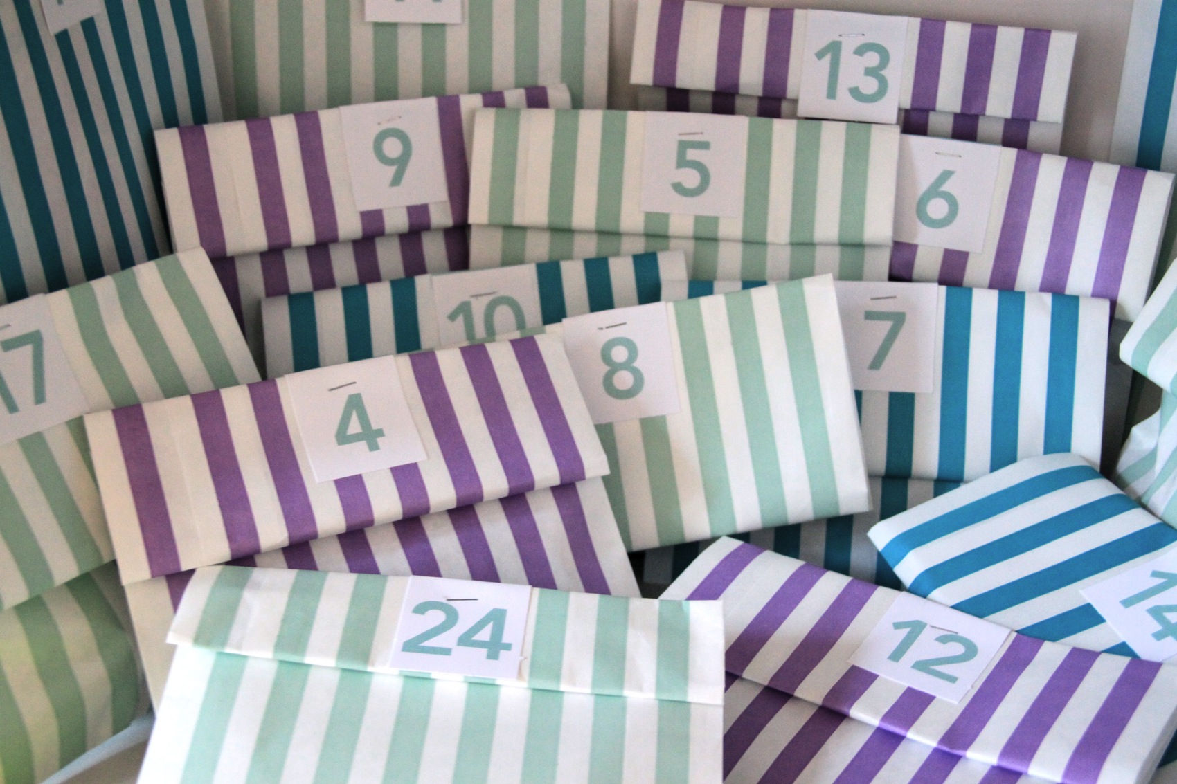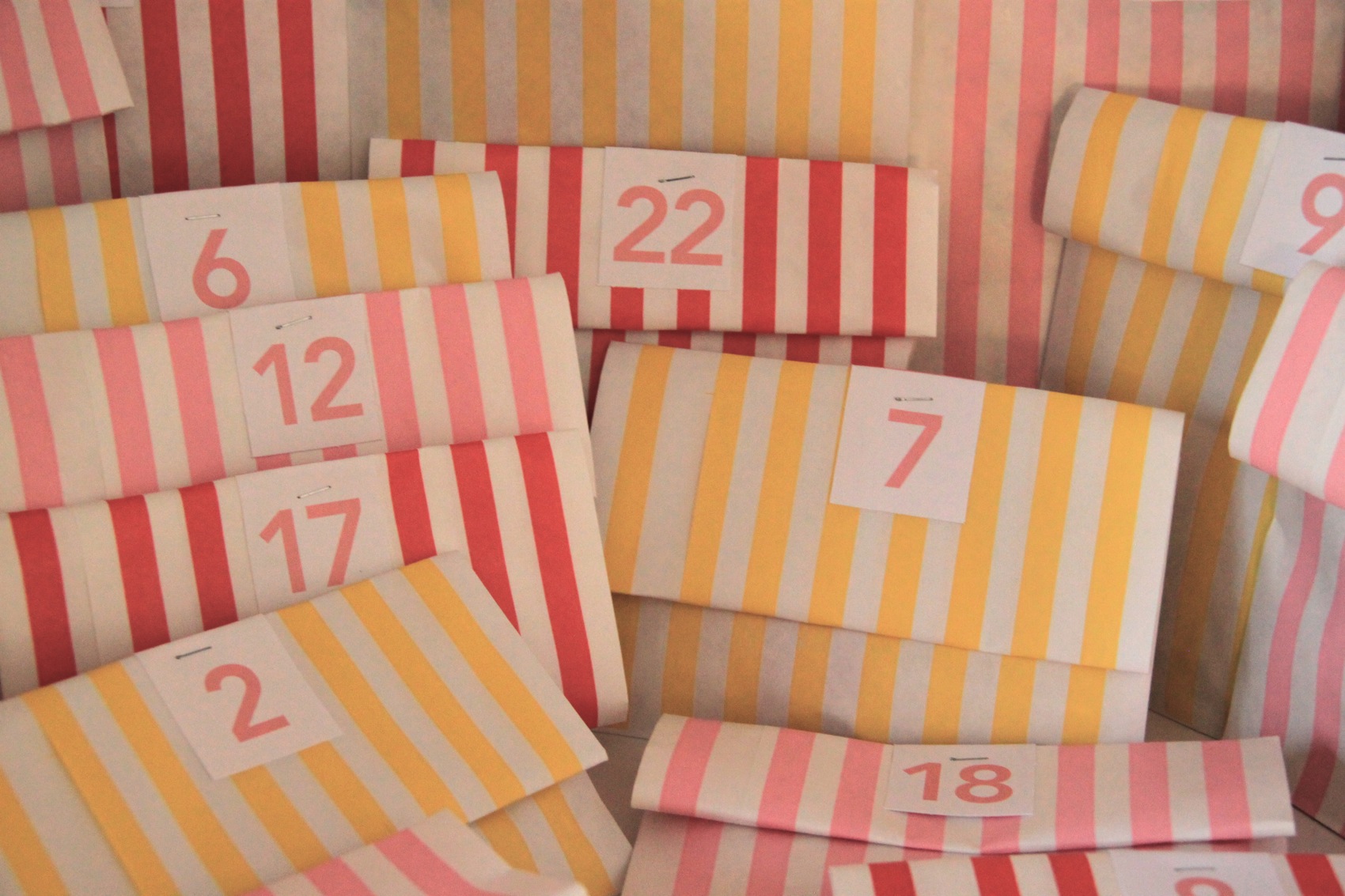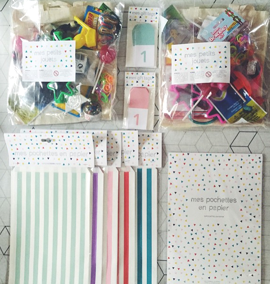 J’ai tout acheté chez My Little Day : pochettes, étiquettes avec les numéros et cadeaux. En effet le site propose des pochettes contenant 24 cadeaux, c’est juste mega pratique. J’ai juste remplacé 2 ou 3 petites choses (sucettes que mes enfants n’aiment pas notamment).