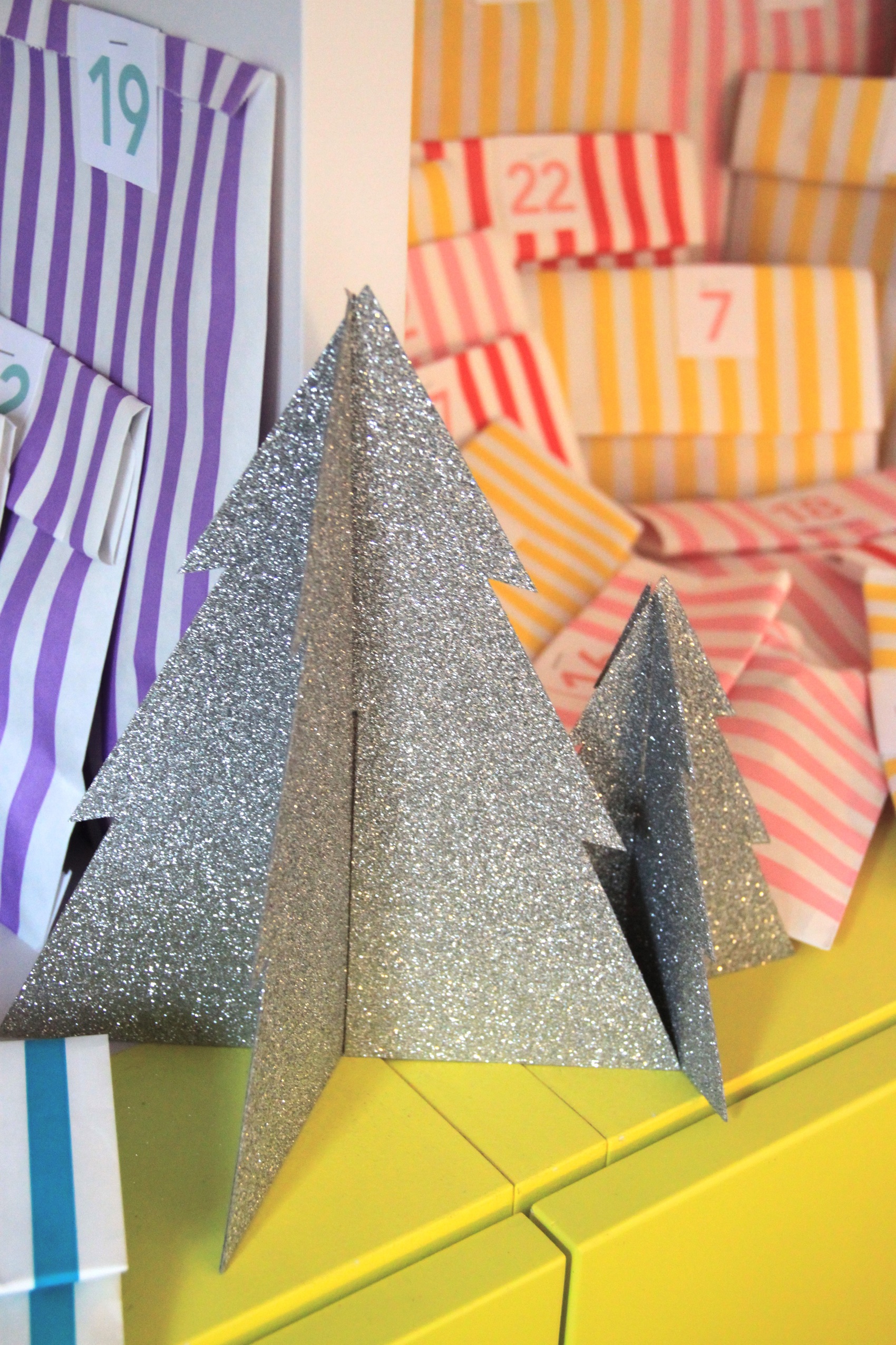 J’ai rempli les pochettes avec les cadeaux, agrafé les étiquettes et tout disposé sur le meuble du salon. J’ai également disposé 2 sapins à paillettes (également trouvés chez My little day) et j’ai réutilisé les lettres de la guirlande à écrire que j’ai depuis 2 ans pour personnaliser le tout.