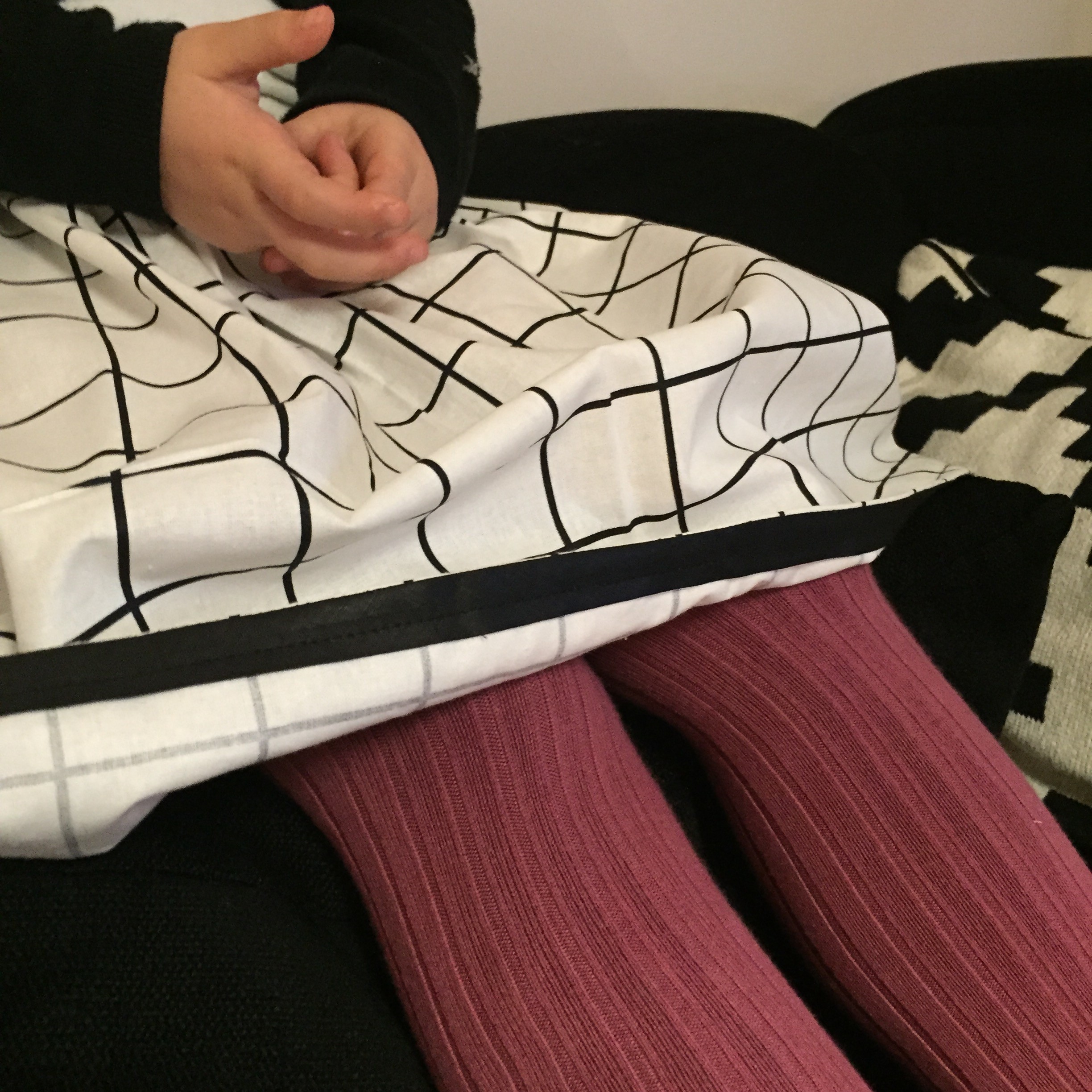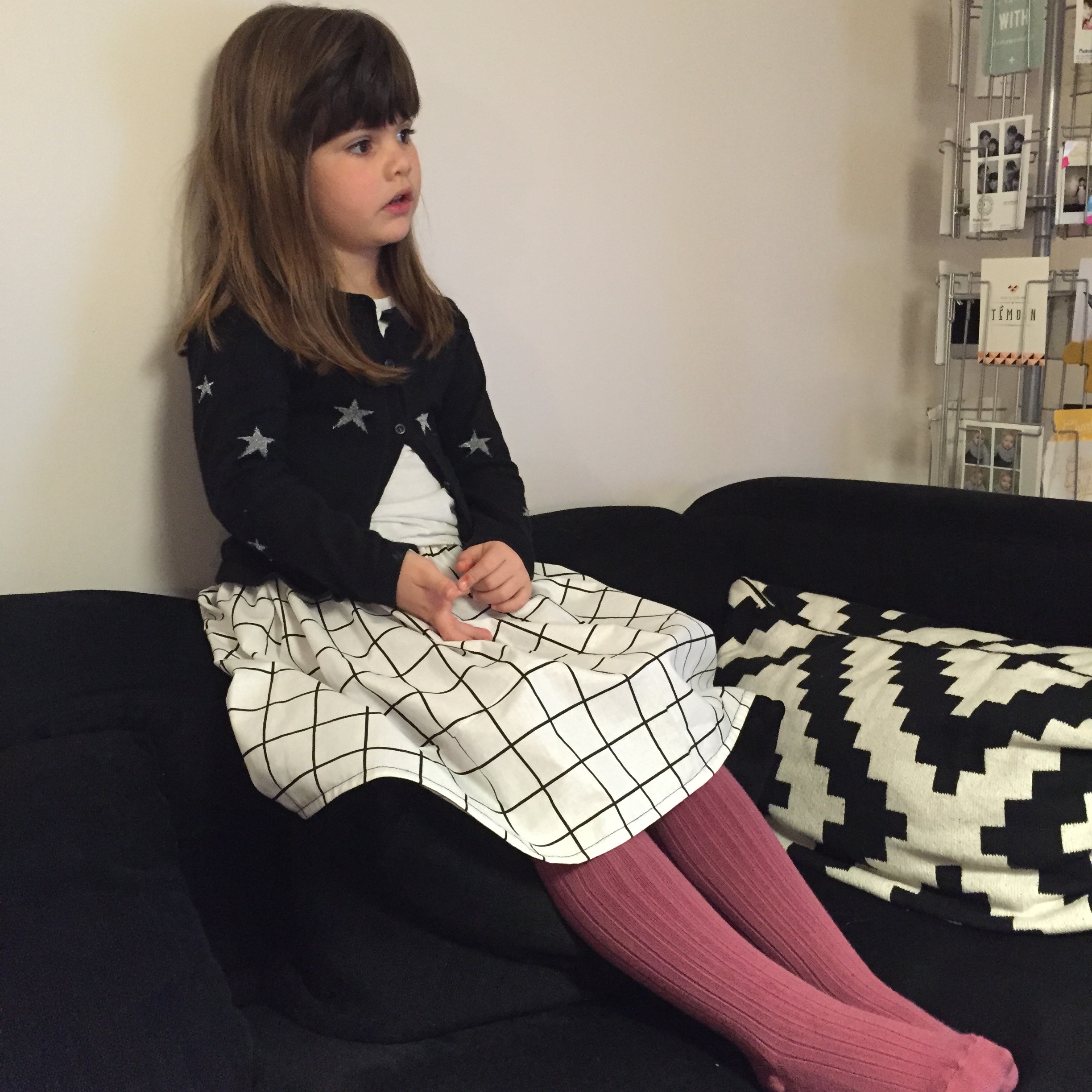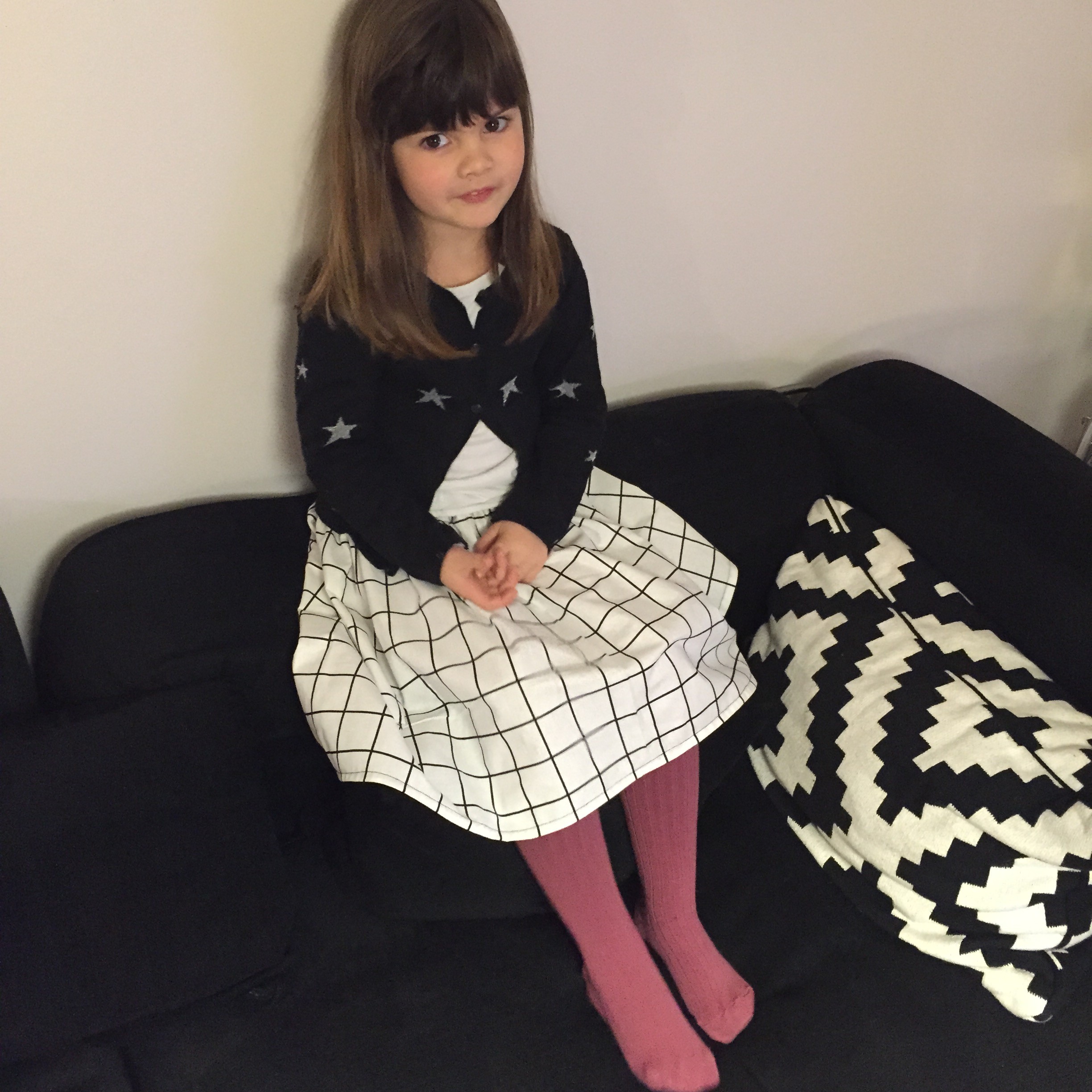 Et pour trancher ce tissu qui fait assez adulte finalement, j’ai mis à Louise des collants Collégien* rose (je vous parlais de la marque ici aussi).
