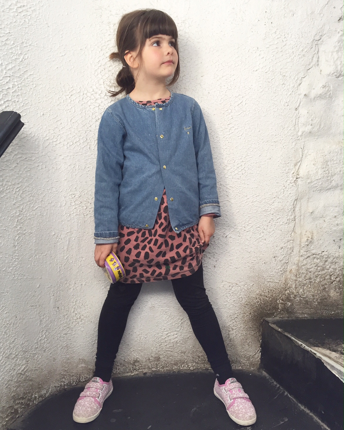 Louise porte : une veste en jean Mathilde Cabanas x Poudre Organic, une robe Bobo Choses (old), des baskets* trop chouettes de la marque Faguo issues de la collaboration avec les célèbres Monsieur Madame (attention, c’est une édition limités) et des lunettes Molo kids achetées chez Dino Deluxe.