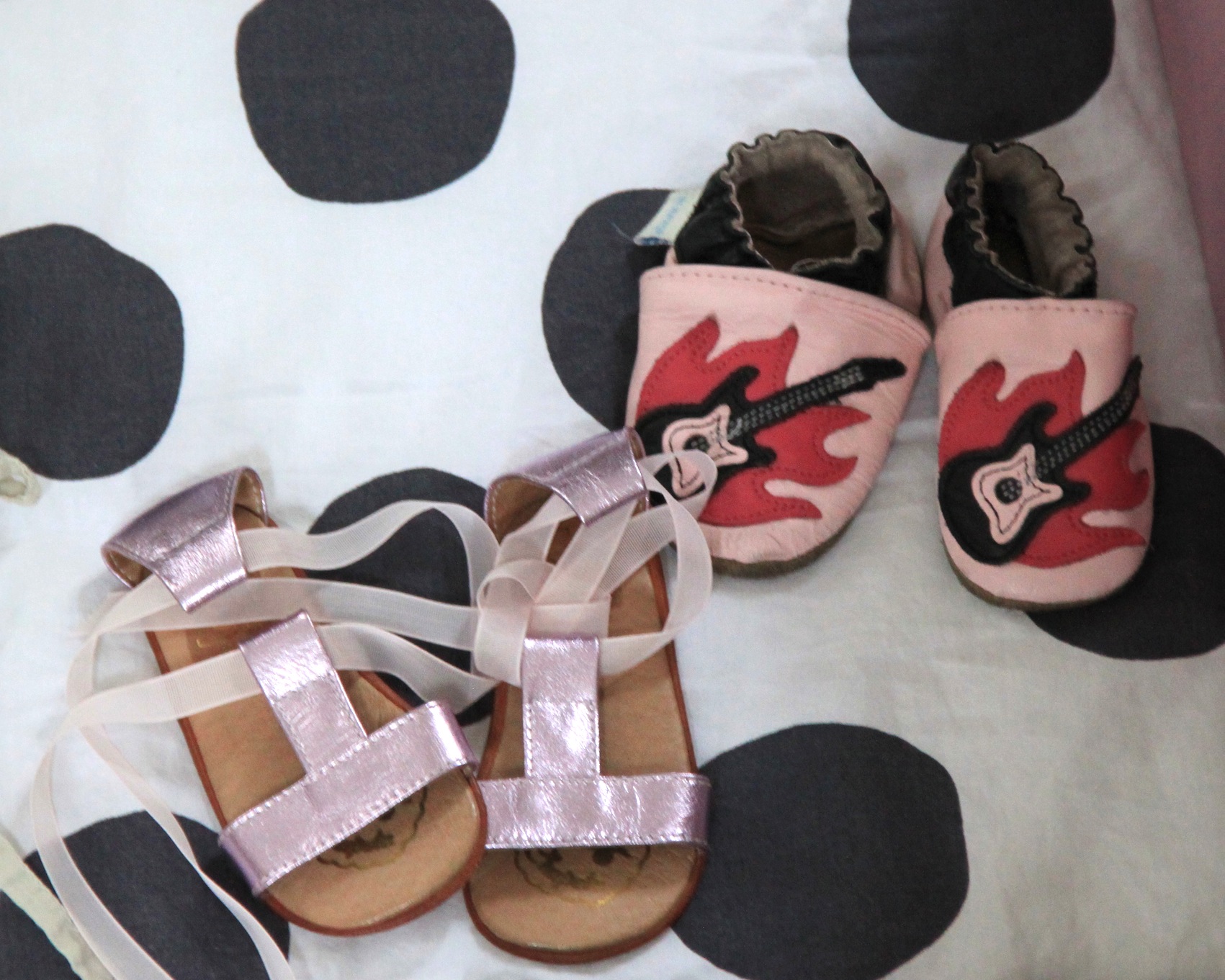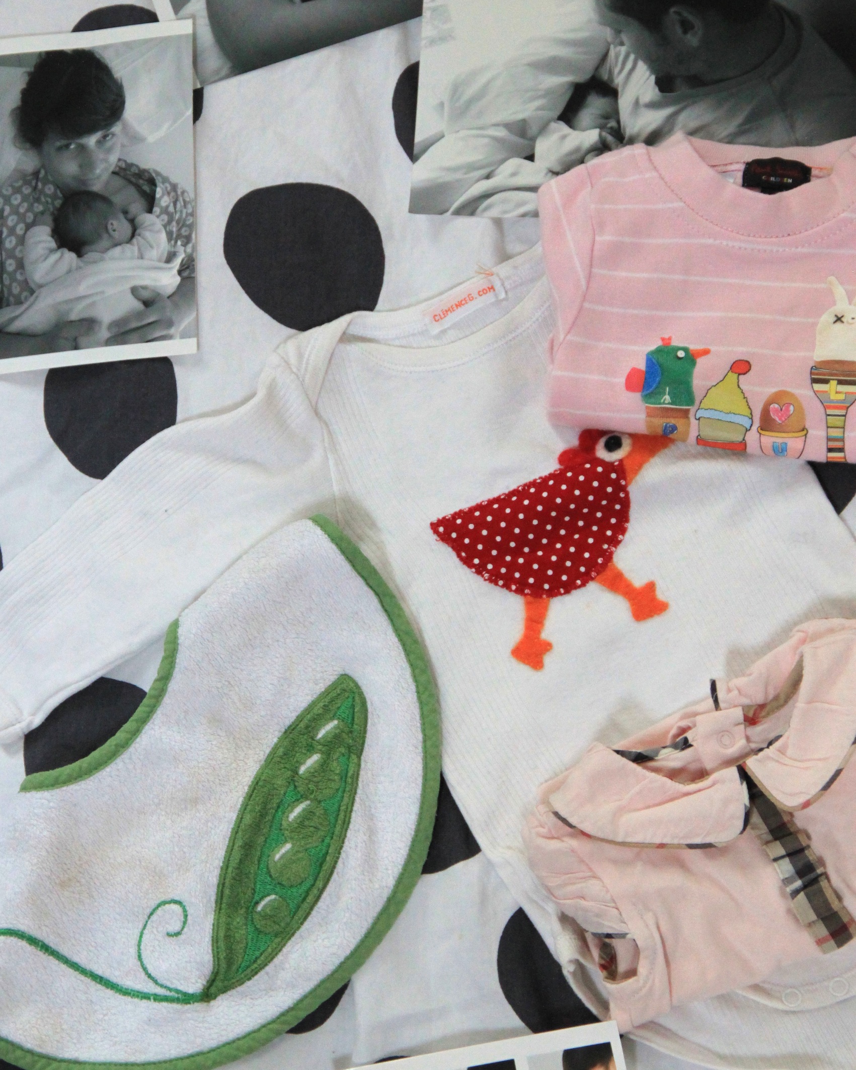 Le premier body que je lui ai acheté quand j’ai su que ce serait une fille (avec la poule) et d’autres que j’aime beaucoup. Et aussi le bavoir petit pois que j’avais acheté car je l’avais surnommée comme ça après ma première visite chez la gynéco en voyant ce petit point sur l’écran.