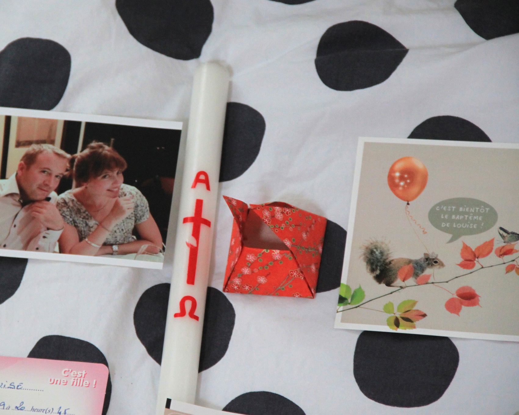 Son parrain et sa marraine, le cierge de son baptême, un des ballotins que j’avais réalisé en origami pour mettre les dragées et son faire-part.