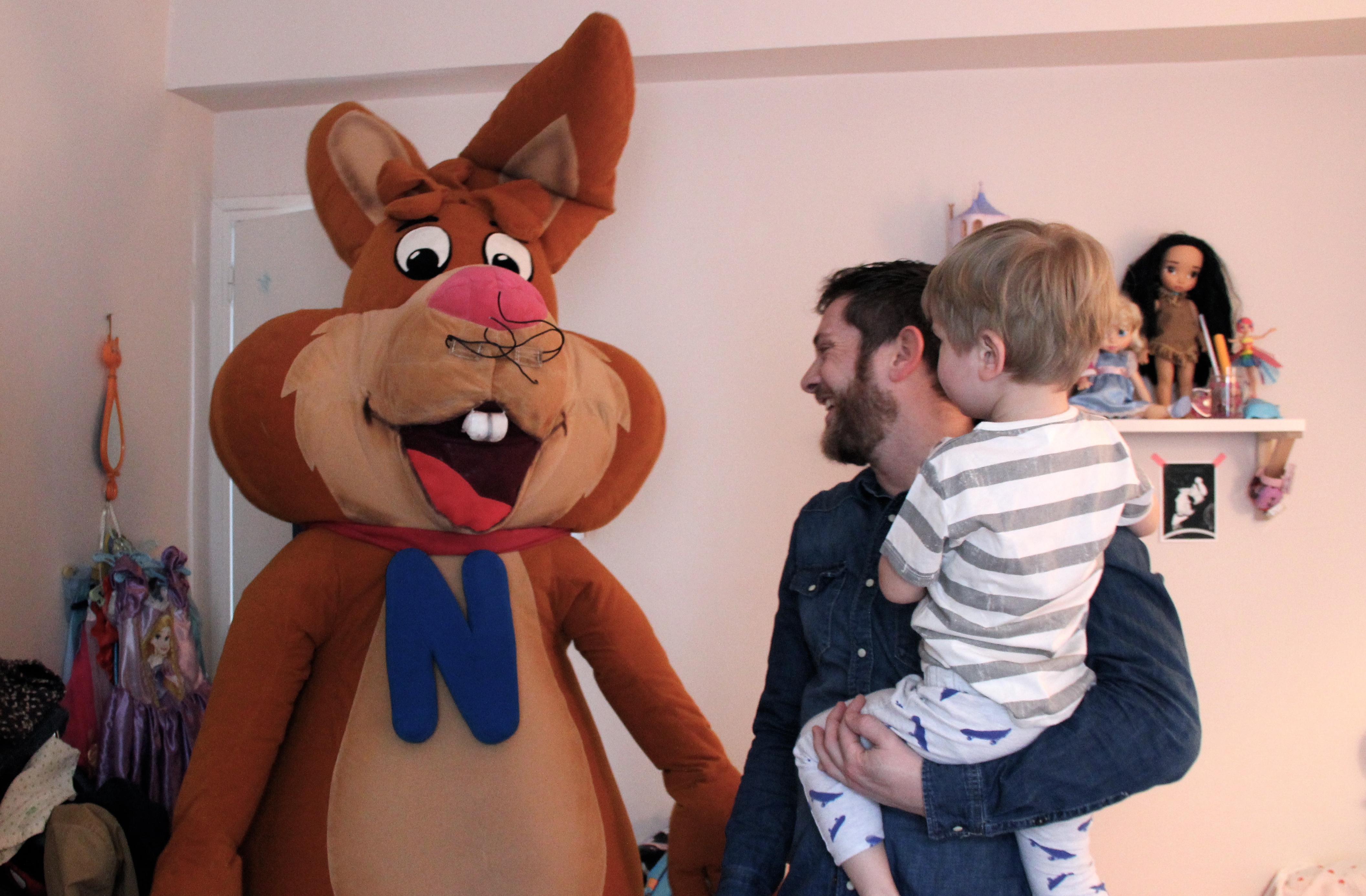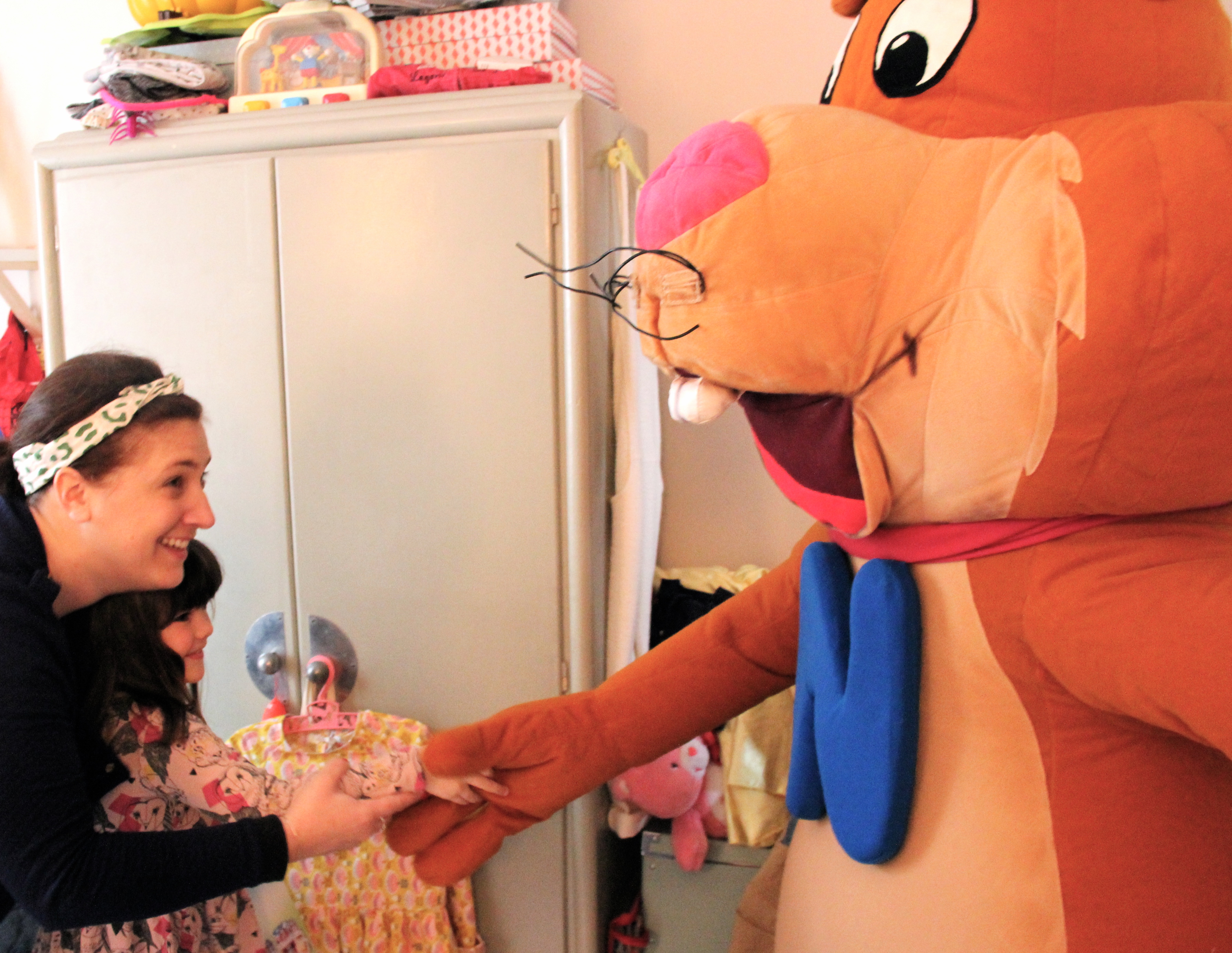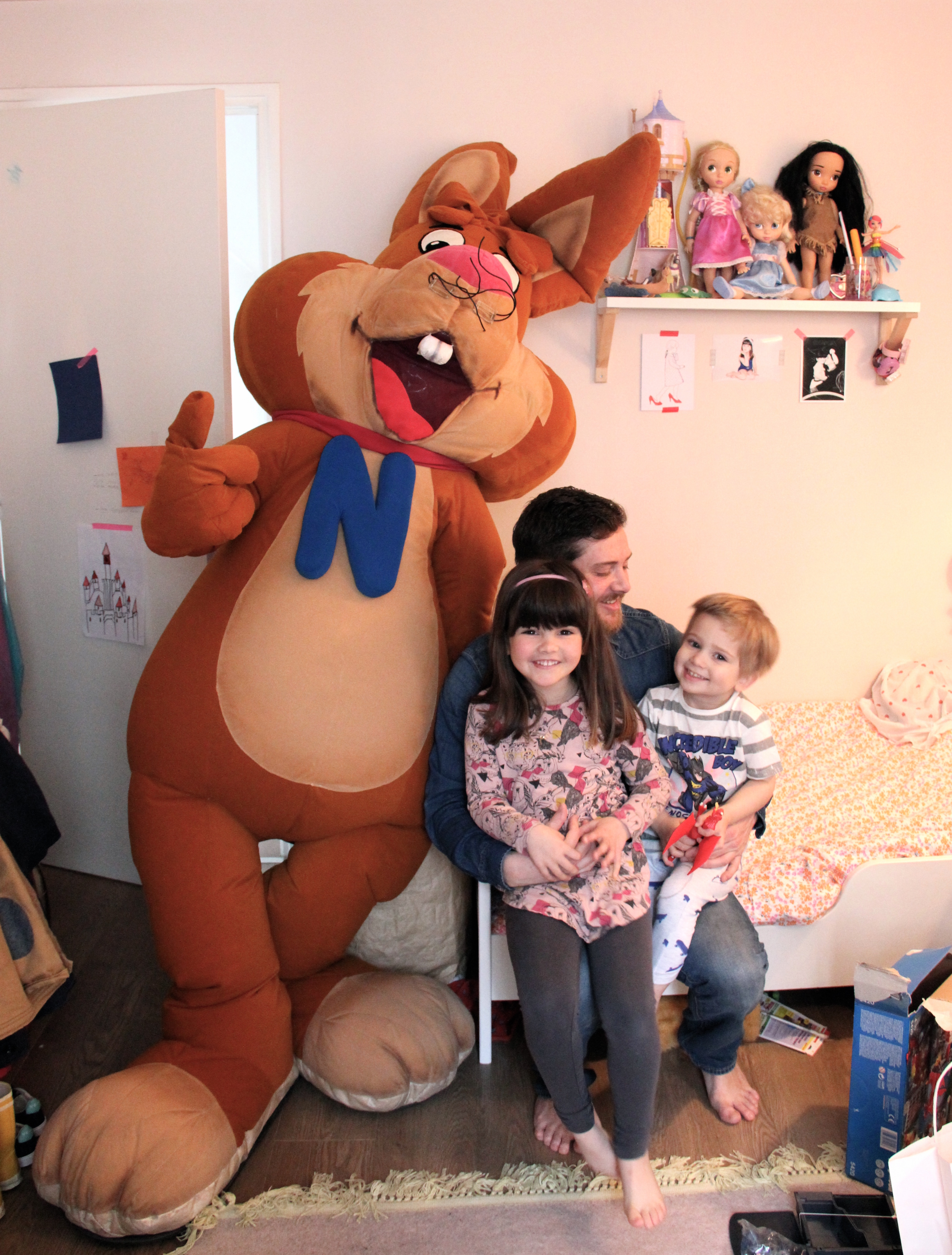 Notre visiteur a eu beaucoup de mal à passer par la porte et à grimper nos escaliers. 5 bonnes minutes d’escalade périlleuse à reculons plus tard, il a débarqué dans la chambre de Louise et Lucien.
