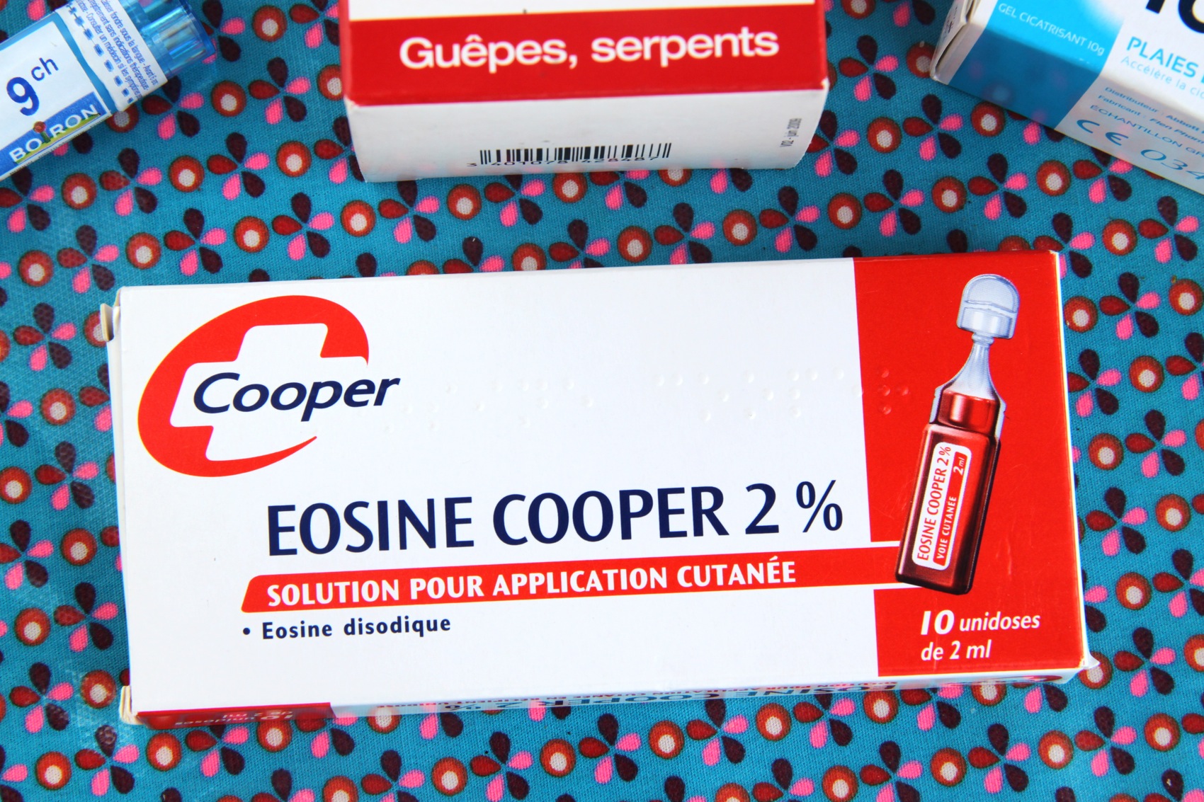 de l’éosine pour nettoyer les bobos (à utiliser avant la pommade cicatrisante donc!)