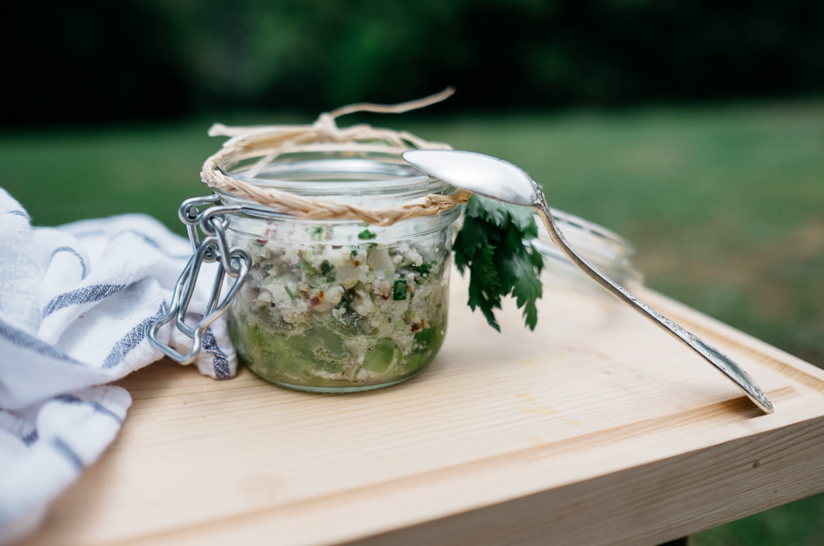 J’étais dans la Team Entrée et j’ai pris beaucoup de plaisir à cuisiner, apprendre et essayer d’apporter ma petite touche DIY avec une petite tresse de rafia mêlée à une branche de persil plat.