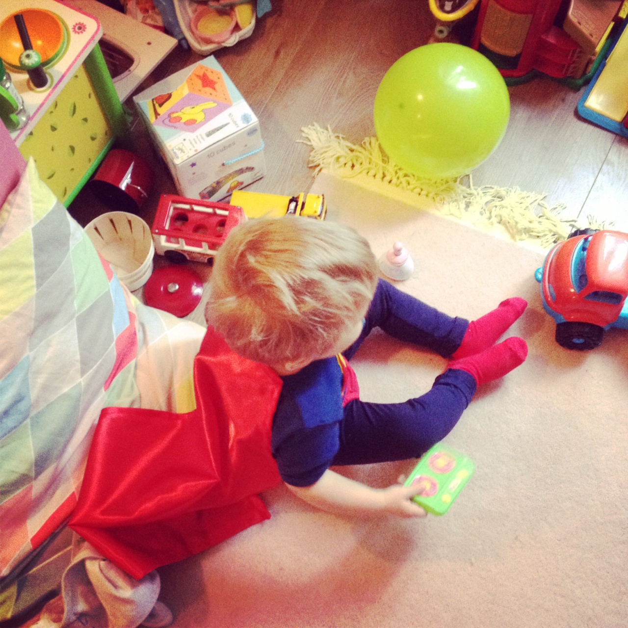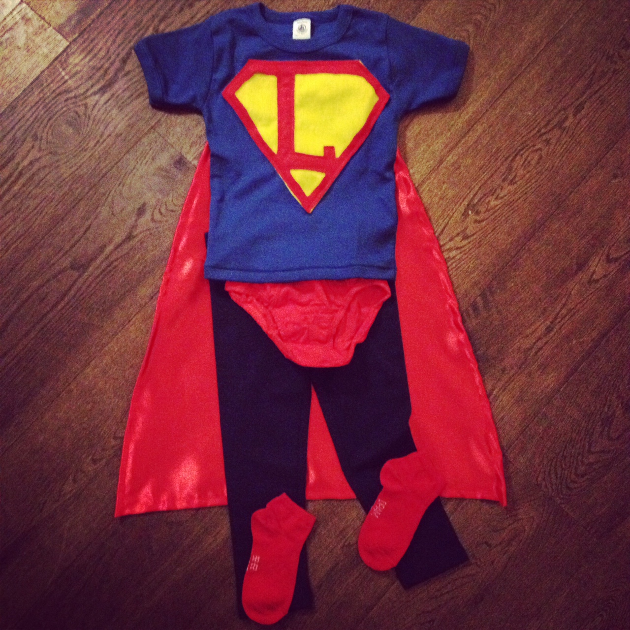 – Pour le reste, faites avec les moyens du bord. Si le leggings n’est pas de la bonne couleur, ce n’est pas grave. D’ailleurs je n’ai pas réussi à trouver de bleu roi comme pour le t-shirt. Par contre n’oubliez pas le slip!