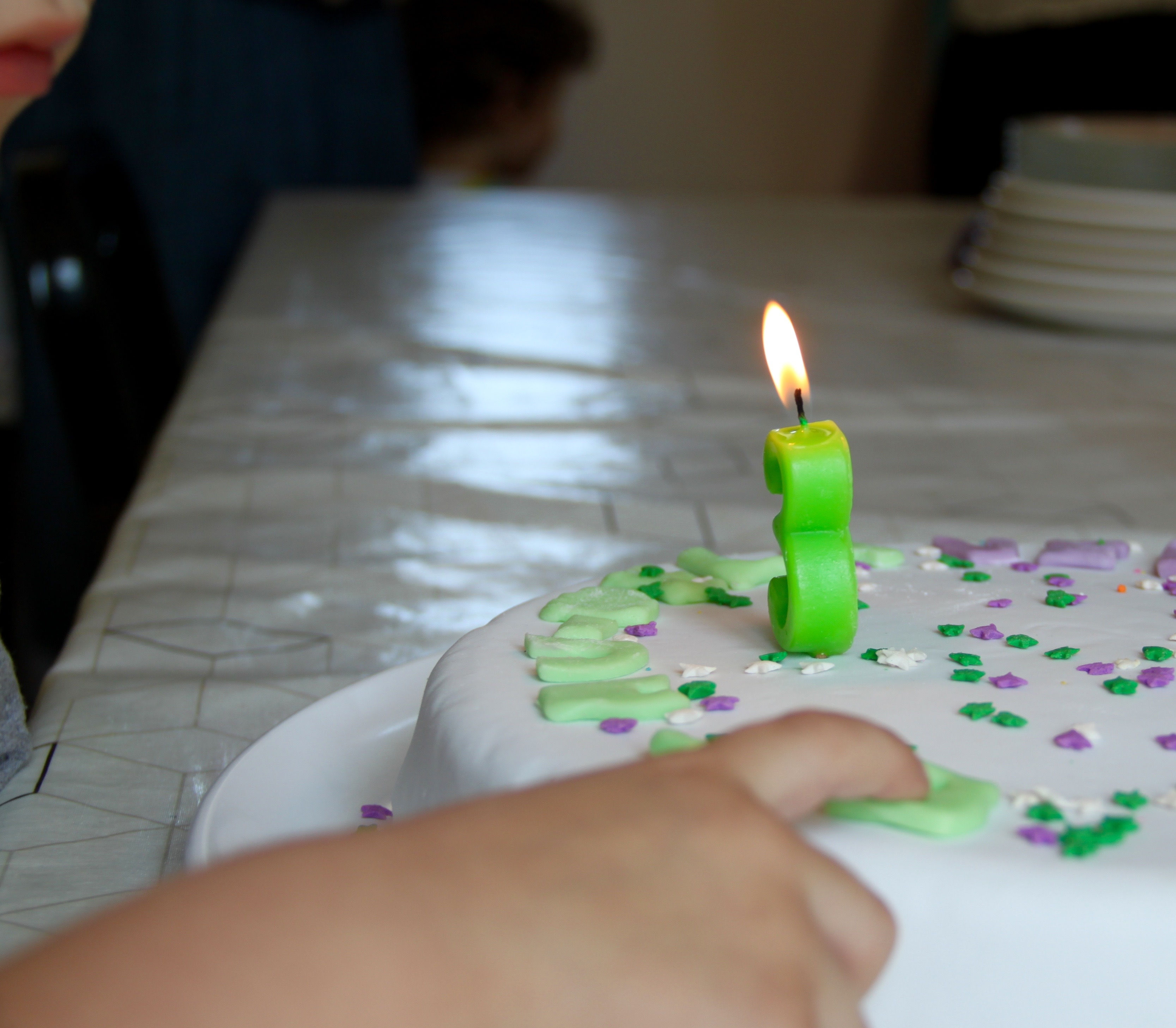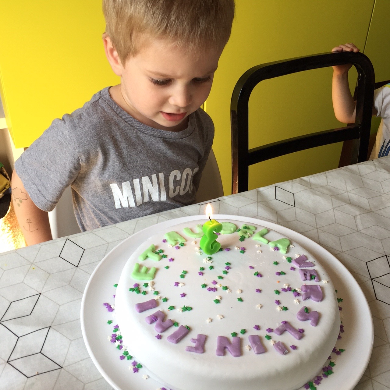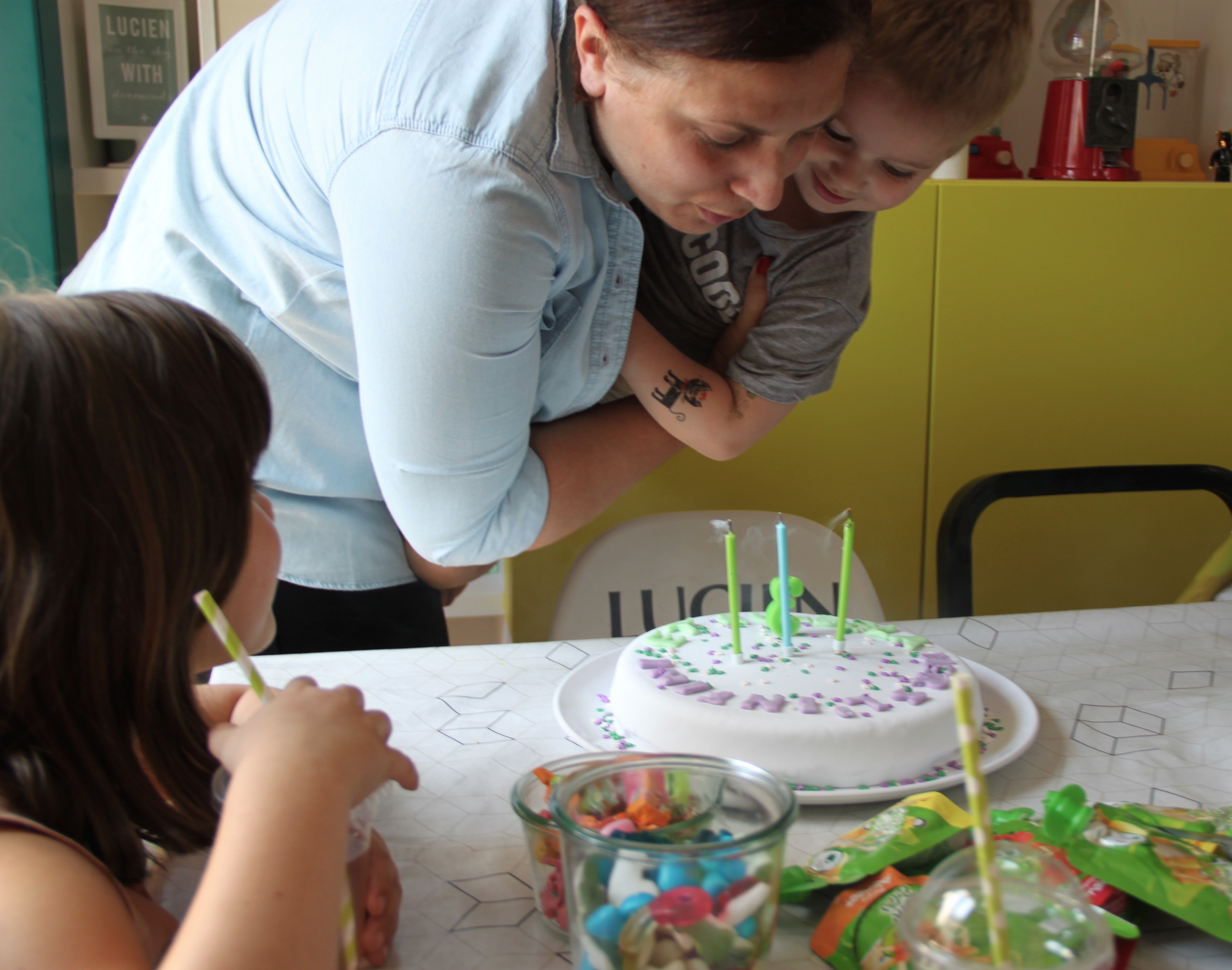 Au moment de souffler sa bougie 3, Lucien a voulu enlever Buzz et puis il s’est aussi dit qu’une seule bougie s’était quand même pas le considérer à sa juste valeur alors Buzz a été évincé et je suis vite aller prendre 3 bougies dans la cuisine…et hop!